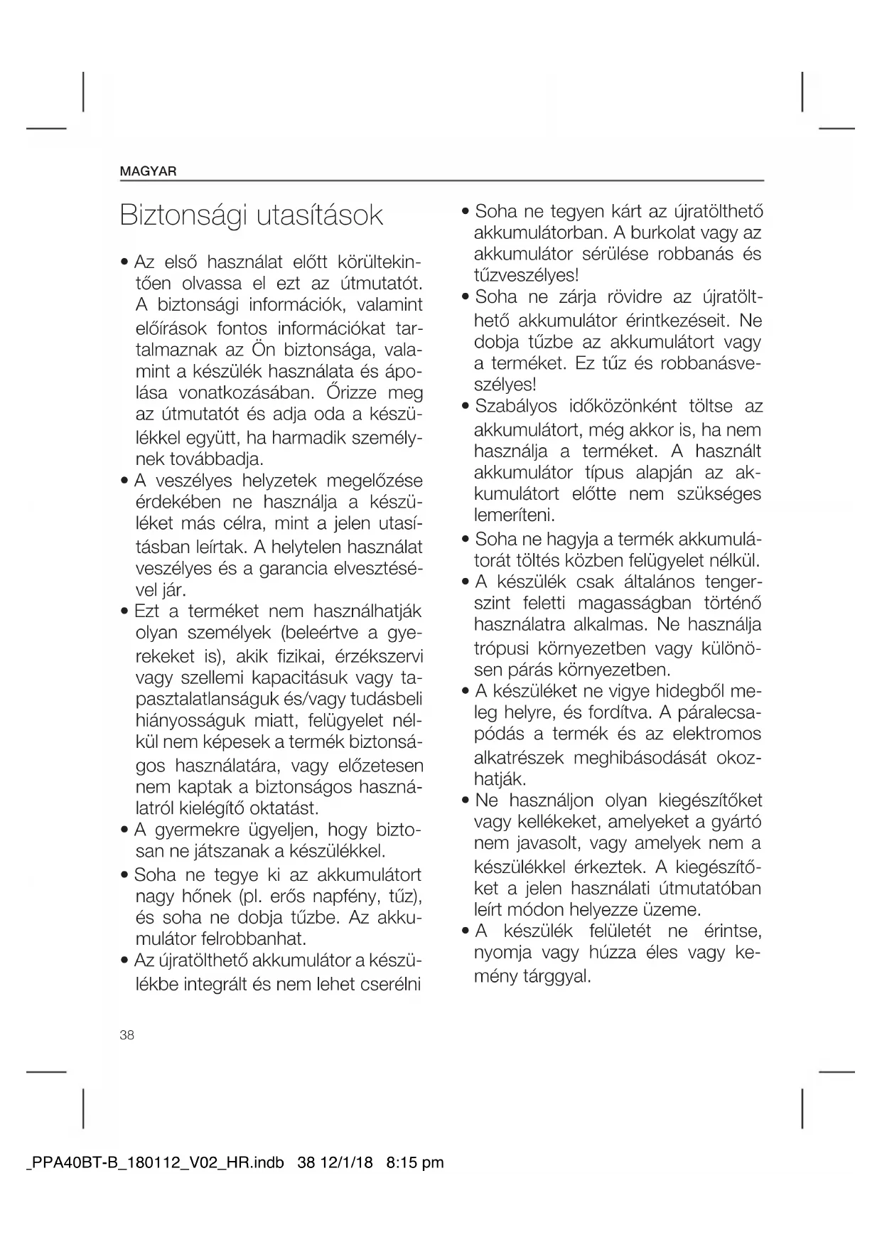 - Körültekintően olvassa el a haszná- lati útmutatót a helytelen használat miatt bekövetkező károsodások megelőzése érdekében. Vegye fi- IM_PPA40BT-B_180112_V02_HR.indb 40 12/1/18 8:15 pm41 MAGYAR gyelembe a biztonsági utasításokat. Őrizze meg a használati útmutatót későbbi esetekre, és adja át ezt is, ha a készüléket átadja másnak. Tá- volítsa el a csomagolóanyagot és el- lenőrizze e készüléket, hogy minden megvan-e és ép-e.