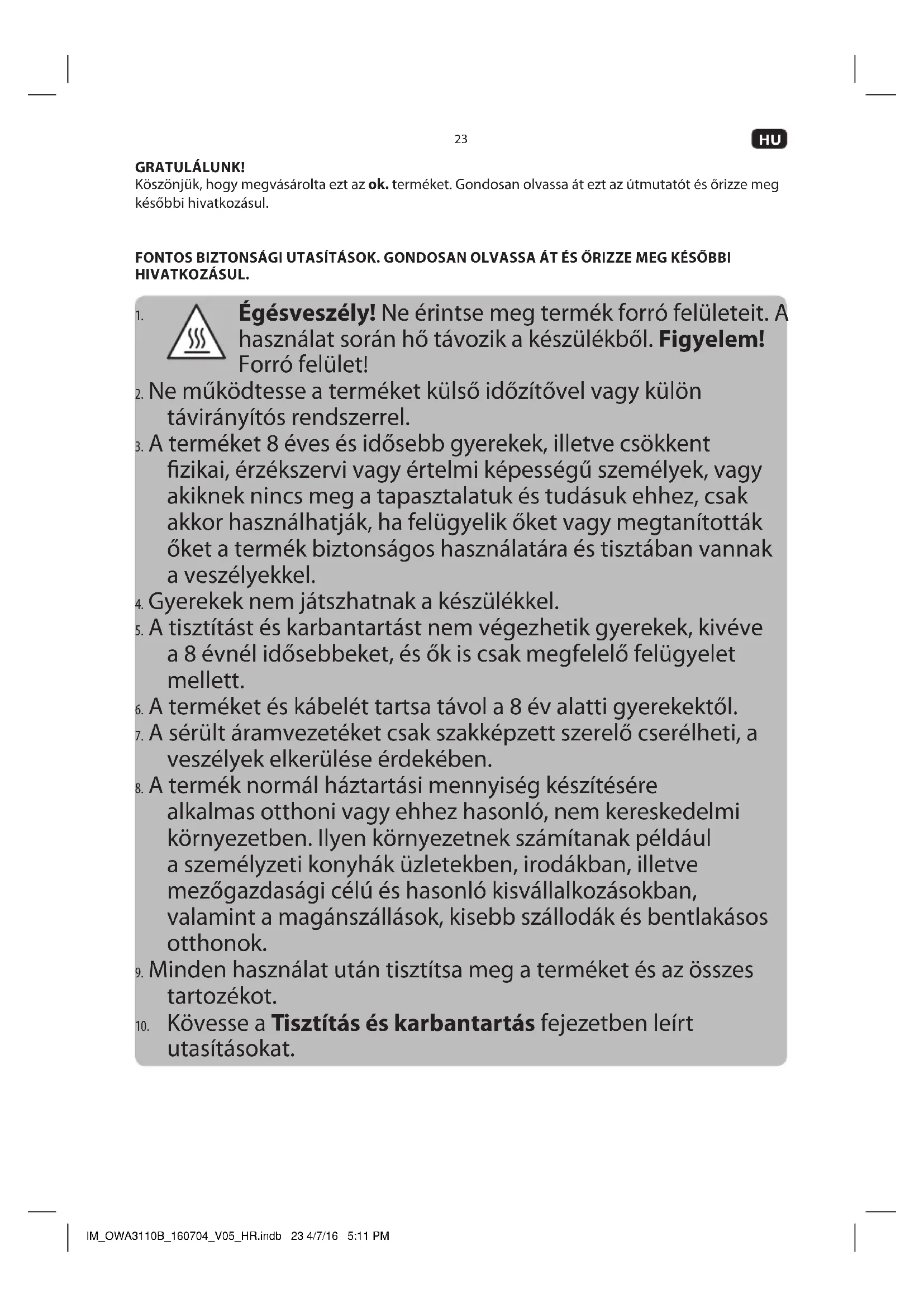 5. A tisztítást és karbantartást nem végezhetik gyerekek, kivéve