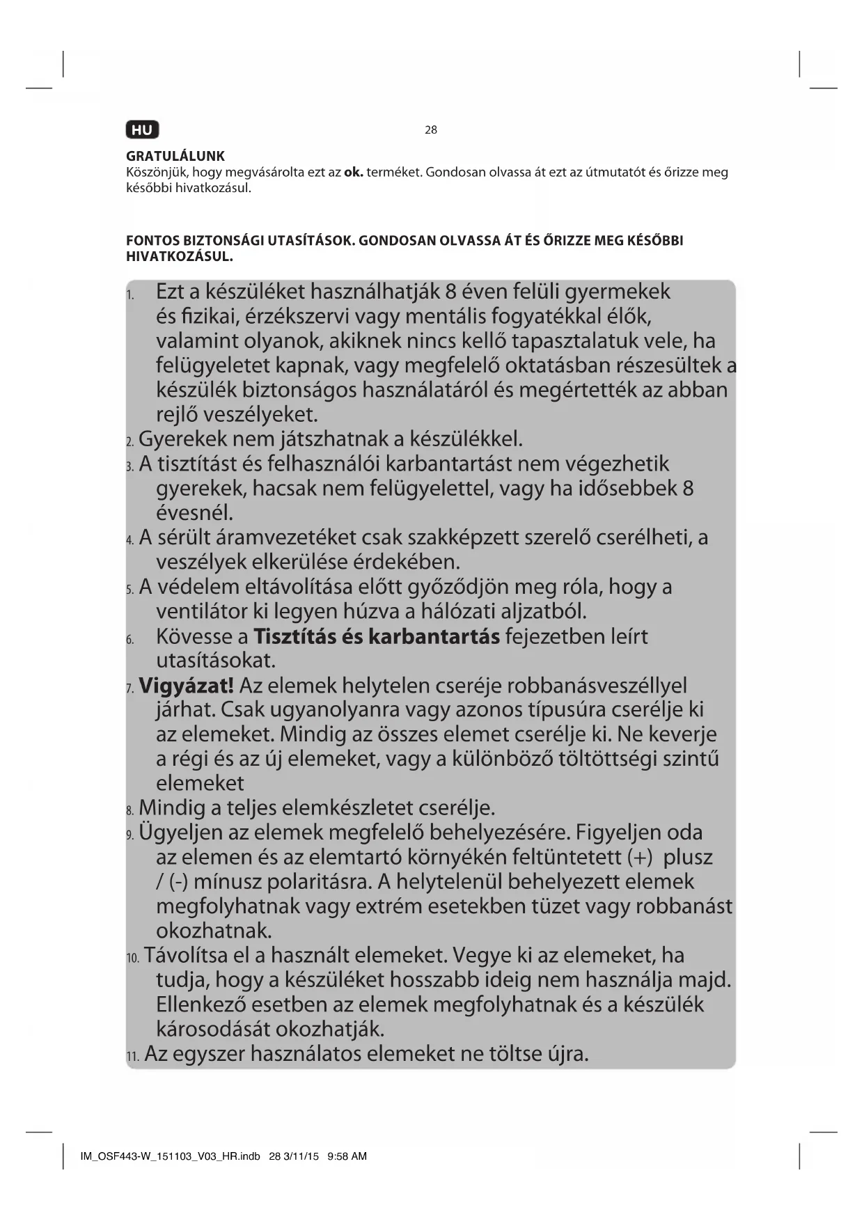 Ne tegye ezt a készüléket a válogatás nélküli kommunális hulladékba. Vigye el a villamos és elektronikus készülékek számára kijelölt WEEE gyűjtőpontba. Ha így tesz, segít megőrizni a természeti erőforrásokat és védi a környezetet. További információért vegye fel a kapcsolatot az értékesítőjével vagy a helyi hatósággal. Az elemek megsemmisítését végezze környezetbarát módon. Ne dobja az elemeket a háztartási hulladékok közé. Használja a helyi ártalmatlanító-begyűjtő rendszert, vagy kérje ki kereskedőjének tanácsát. IM_OSF443-W_151103_V03_HR.indb 32 3/11/15 9:58 AM33