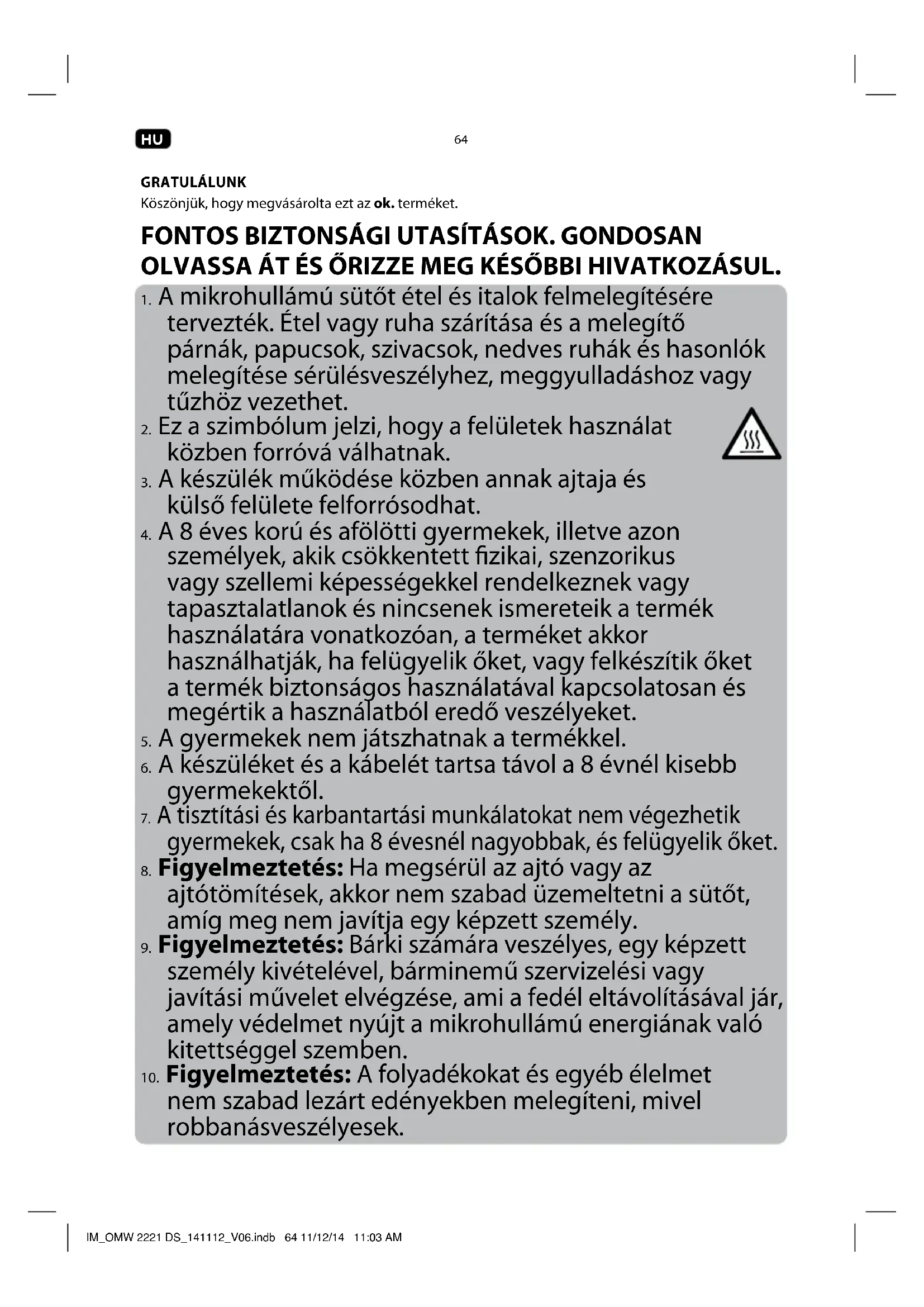 csatlakoztatva, bizonyosodjon meg, hogy a tápkábel nem akad be a forró sütő ajtajába. A forró sütő ajtaja megolvaszthatja a kábel szigetelését és veszélyes lehet. IM_OMW 2221 DS_141112_V06.indb 67 11/12/14 11:03 AM68
