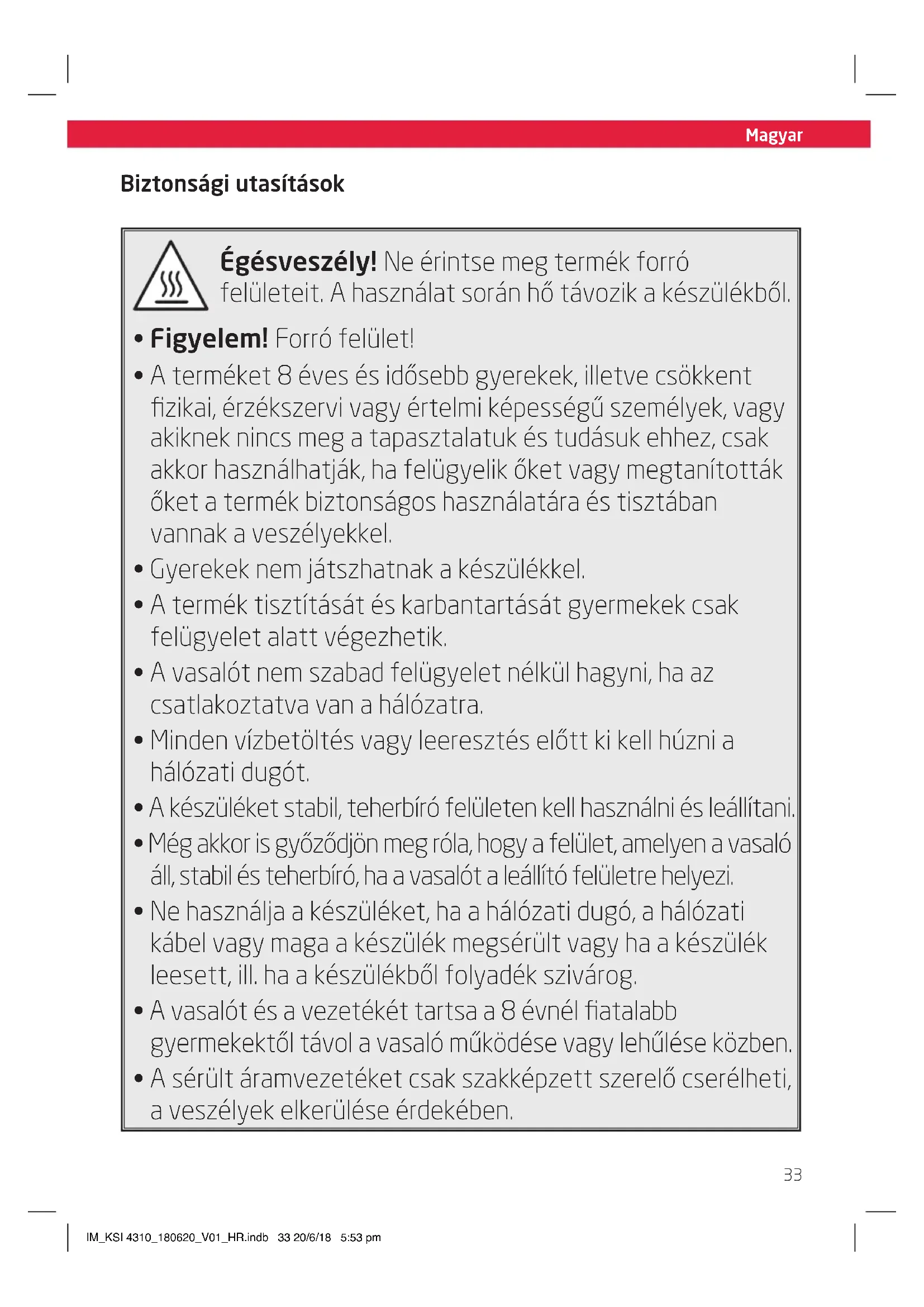 - A sérült áramvezetéket csak szakképzett szerelő cserélheti, a veszélyek elkerülése érdekében. IM_KSI 4310_180620_V01_HR.indb 33 20/6/18 5:53 pmMagyar