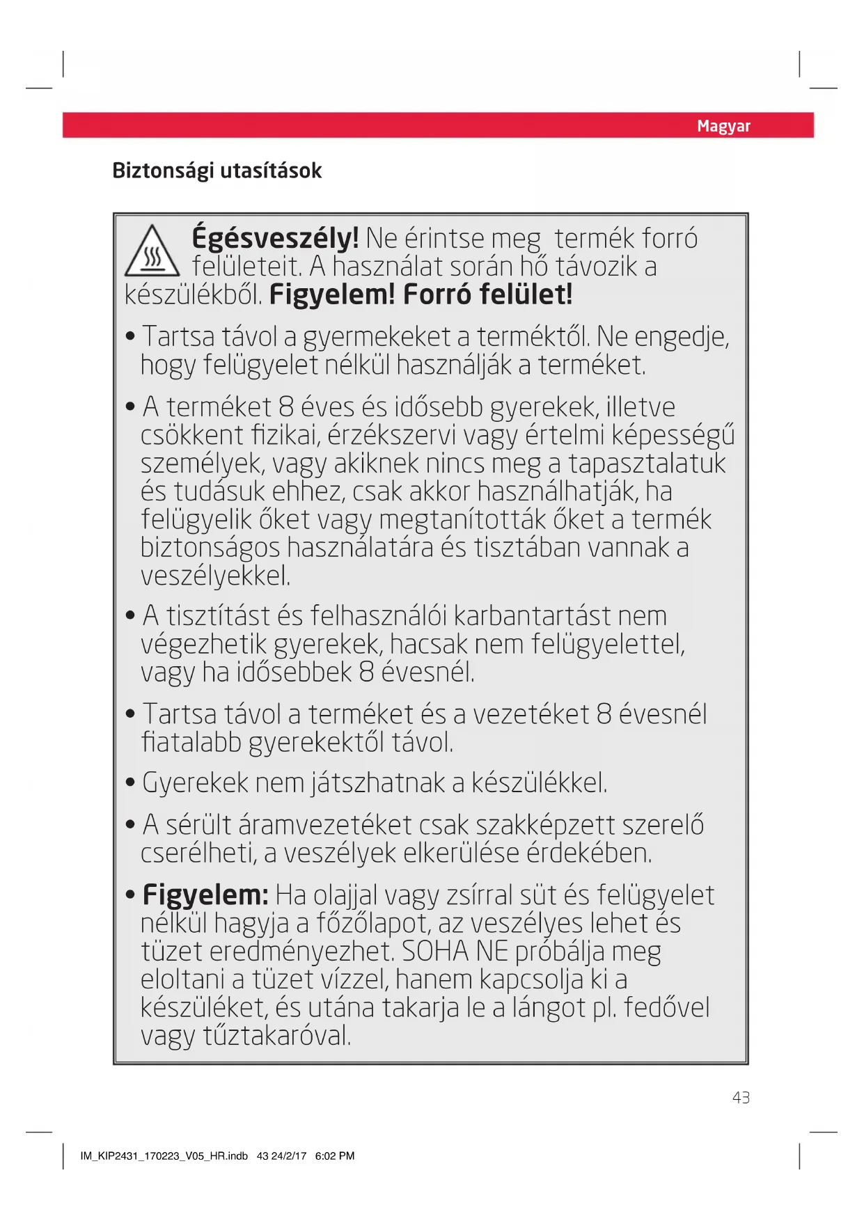 - Figyelem: Ha olajjal vagy zsírral süt és felügyelet nélkül hagyja a főzőlapot, az veszélyes lehet és tüzet eredményezhet. SOHA NE próbálja meg eloltani a tüzet vízzel, hanem kapcsolja ki a készüléket, és utána takarja le a lángot pl. fedővel vagy tűztakaróval. IM_KIP2431_170223_V05_HR.indb 43 24/2/17 6:02 PMMagyar