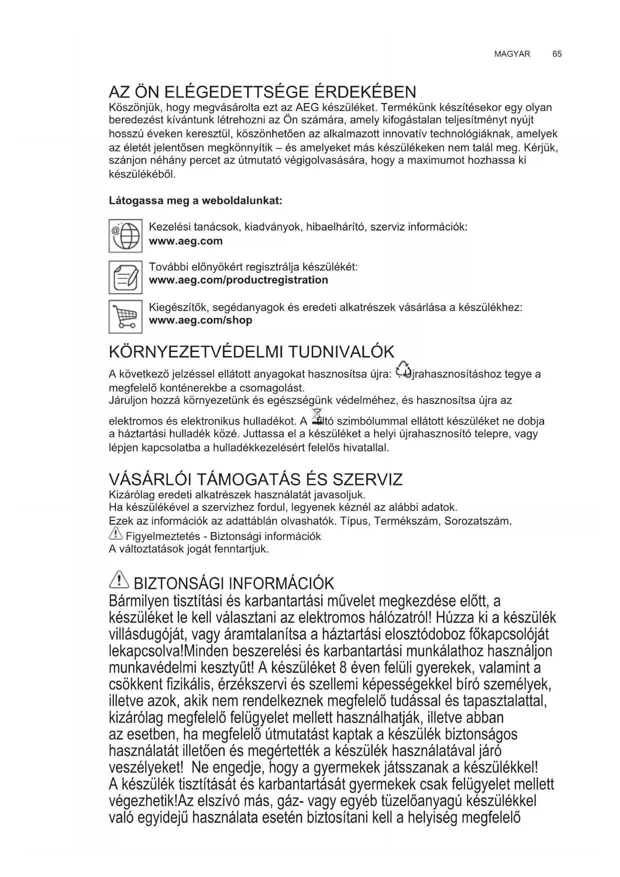 Витяжка обладнана системою освітлення на основі технології діодів (LED). ДІОДИ забезпечують оптимальне освітлення, тривалість їх в 10 раз вища від звичайних лампочок та дають 90% економії електроенергії. Увага! Не дивитися прямо на світодіодну лампочку. Для заміни ламп контактувати авторизований сервісний центр запасних частин.65 MAGYAR AZ ÖN ELÉGEDETTSÉGE ÉRDEKÉBEN Köszönjük, hogy megvásárolta ezt az AEG készüléket. Termékünk készítésekor egy olyan beredezést kívántunk létrehozni az Ön számára, amely kifogástalan teljesítményt nyújt hosszú éveken keresztül, köszönhetően az alkalmazott innovatív technológiáknak, amelyek az életét jelentősen megkönnyítik – és amelyeket más készülékeken nem talál meg. Kérjük, szánjon néhány percet az útmutató végigolvasására, hogy a maximumot hozhassa ki készülékéből. Látogassa meg a weboldalunkat: Kezelési tanácsok, kiadványok, hibaelhárító, szerviz információk: www.aeg.com További előnyökért regisztrálja készülékét: www.aeg.com/productregistration Kiegészítők, segédanyagok és eredeti alkatrészek vásárlása a készülékhez: www.aeg.com/shop