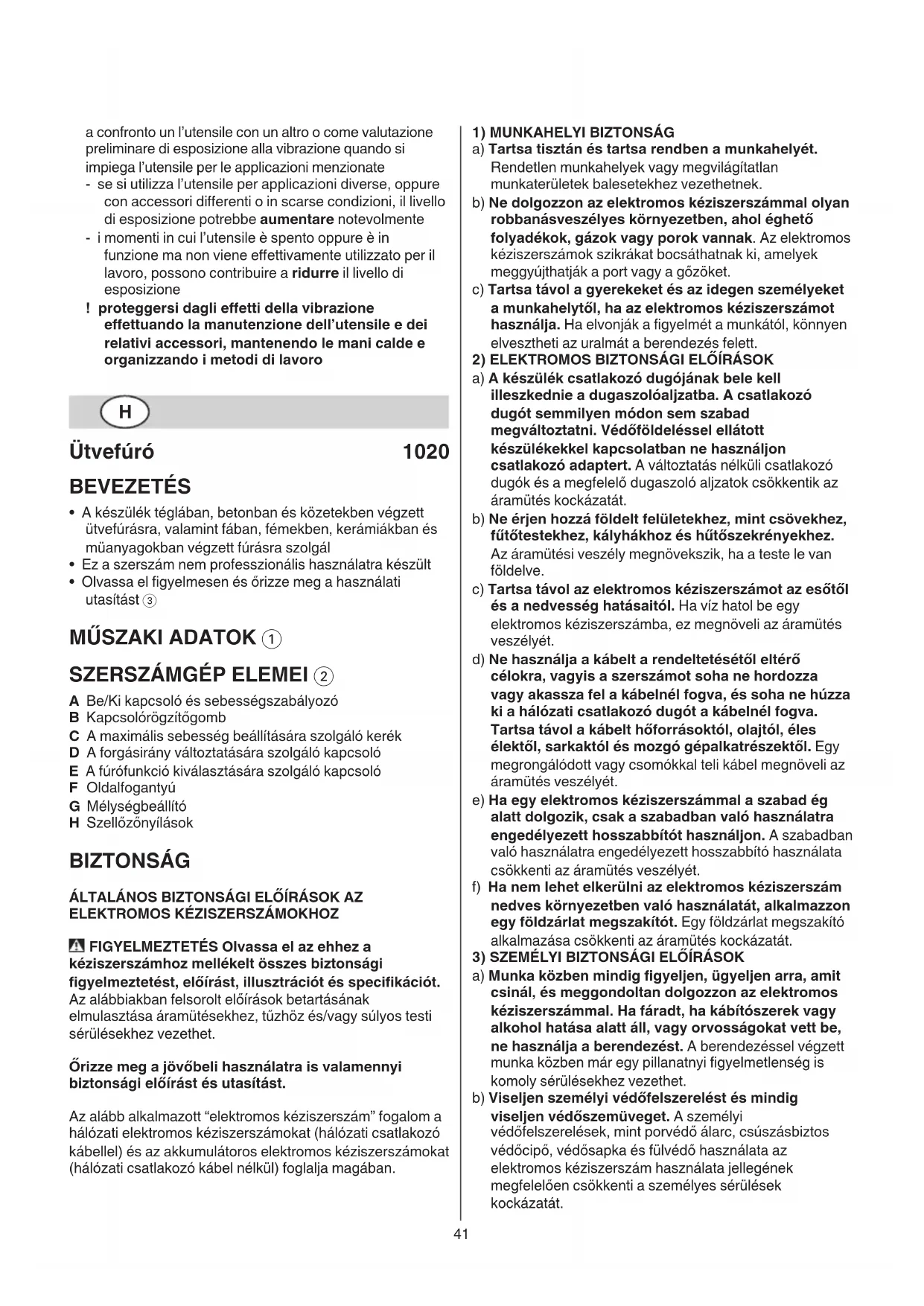 A Be/Ki kapcsoló és sebességszabályozó B Kapcsolórögzítőgomb C A maximális sebesség beállítására szolgáló kerék D A forgásirány változtatására szolgáló kapcsoló E A fúrófunkció kiválasztására szolgáló kapcsoló F Oldalfogantyú G Mélységbeállító H Szellőzőnyílások BIZTONSÁG ÁLTALÁNOS BIZTONSÁGI ELŐÍRÁSOK AZ