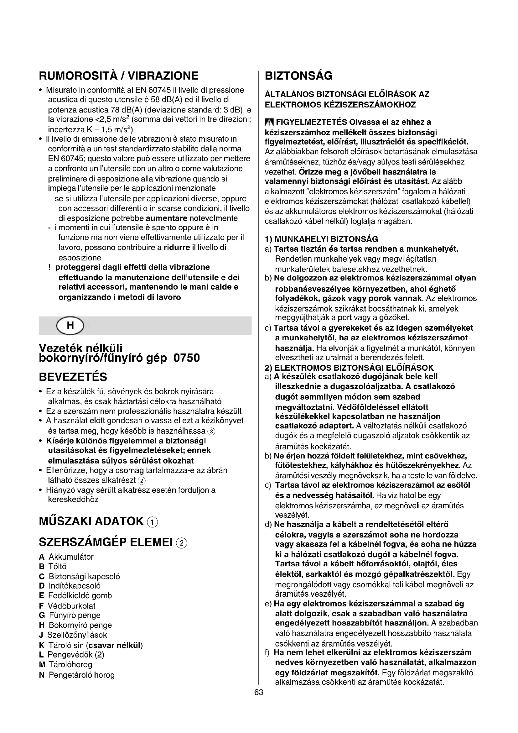A Akkumulátor B Töltő C Biztonsági kapcsoló D Indítókapcsoló E Fedélkioldó gomb F Védőburkolat G Fűnyíró penge H Bokornyíró penge J Szellőzőnyílások K Tároló sín (csavar nélkül) L Pengevédők (2) M Tárolóhorog N Pengetároló horog BIZTONSÁG ÁLTALÁNOS BIZTONSÁGI ELŐÍRÁSOK AZ