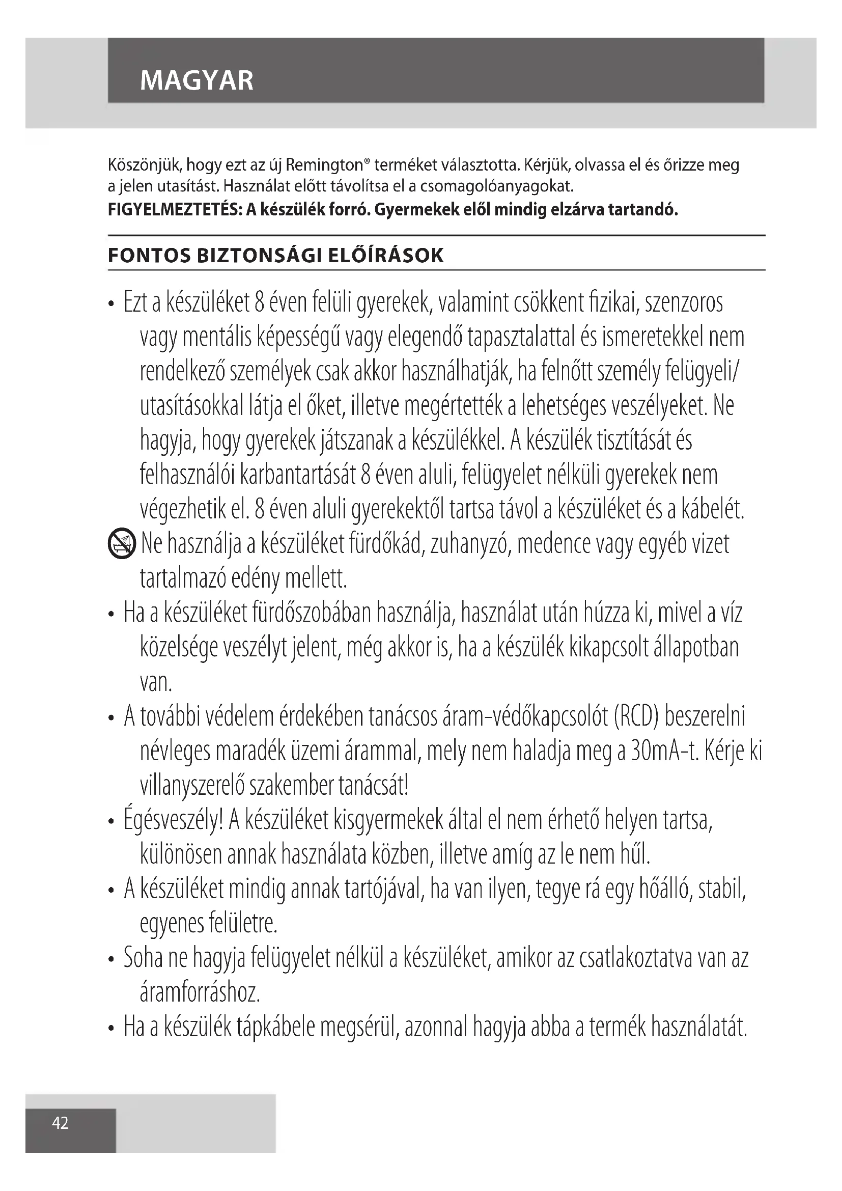 AE42 Köszönjük, hogy ezt az új Remington® terméket választotta. Kérjük, olvassa el és őrizze meg a jelen utasítást. Használat előtt távolítsa el a csomagolóanyagokat. FIGYELMEZTETÉS: A készülék forró. Gyermekek elől mindig elzárva tartandó.