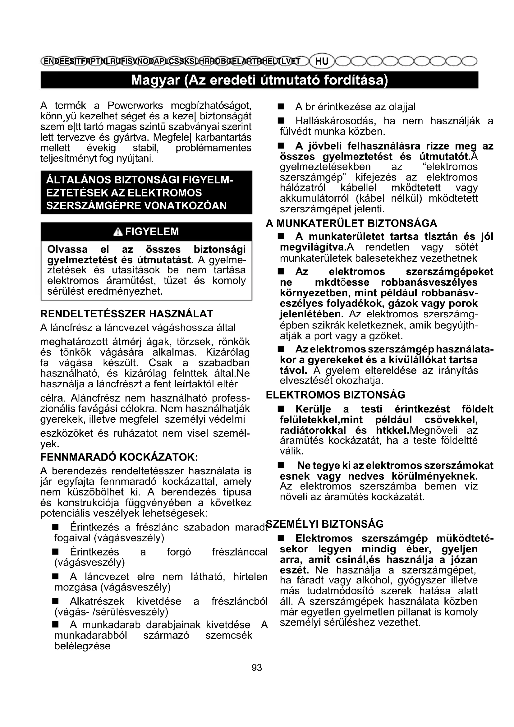 EN DE ES IT FR PT NL RU FI SV NO DA PL CS SK SL HR RO BG EL AR TR HE LT LV ET A termék a Powerworks megbízhatóságot, könn¸yü kezelhet séget és a keze| biztonságát szem e|tt tartó magas szintü szabványai szerint lett tervezve és gyártva. Megfele| karbantartás mellett évekig stabil, problémamentes teljesítményt fog nyújtani.