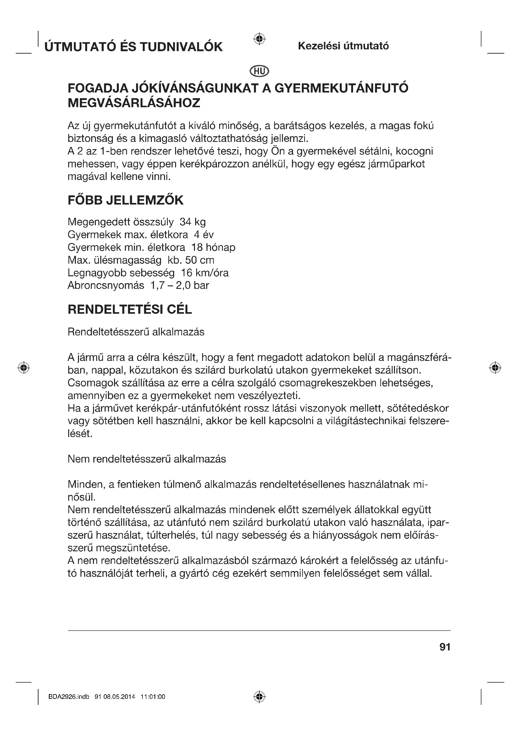 Rendeltetésszerű alkalmazás A jármű arra acélra készült, hogy afent megadott adatokon belül amagánszférá- ban, nappal, közutakon és szilárd burkolatú utakon gyermekeket szállítson. Csomagok szállítása az erre acélra szolgáló csomagrekeszekben lehetséges, amennyiben ez agyermekeket nem veszélyezteti. Ha ajárművet kerékpár-utánfutóként rossz látási viszonyok mellett, sötétedéskor vagy sötétben kell használni, akkor be kell kapcsolni avilágítástechnikai felszere- lését. Nem rendeltetésszerű alkalmazás Minden, afentieken túlmenő alkalmazás rendeltetésellenes használatnak mi- nősül. Nem rendeltetésszerű alkalmazás mindenek előtt személyek állatokkal együtt történő szállítása, az utánfutó nem szilárd burkolatú utakon való használata, ipar- szerű használat, túlterhelés, túl nagy sebesség és ahiányosságok nem előírás- szerű megszüntetése. A nem rendeltetésszerű alkalmazásból származó károkért afelelősség az utánfu- tó használóját terheli, agyártó cég ezekért semmilyen felelősséget sem vállal.