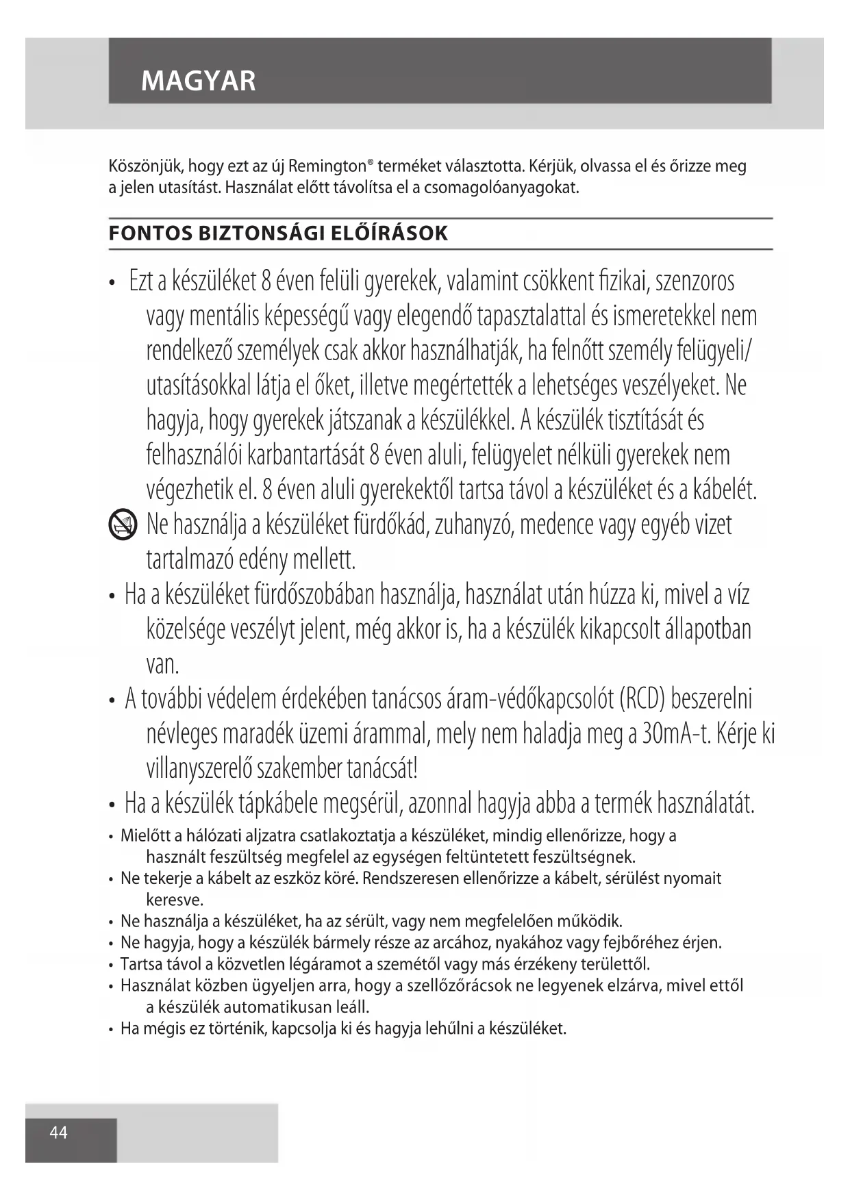AE44 Köszönjük, hogy ezt az új Remington® terméket választotta. Kérjük, olvassa el és őrizze meg a jelen utasítást. Használat előtt távolítsa el a csomagolóanyagokat.