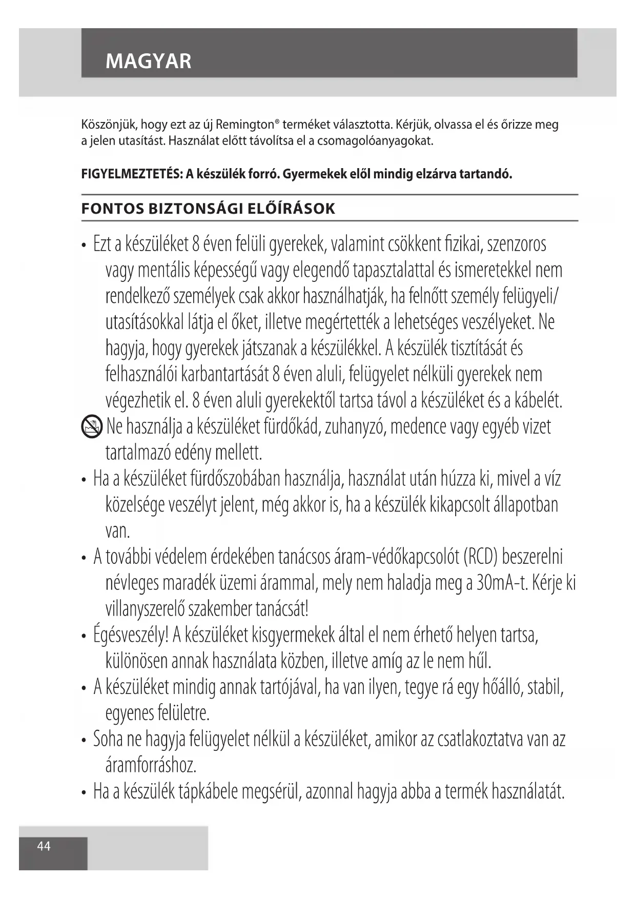 AE44 Köszönjük, hogy ezt az új Remington® terméket választotta. Kérjük, olvassa el és őrizze meg a jelen utasítást. Használat előtt távolítsa el a csomagolóanyagokat. FIGYELMEZTETÉS: A készülék forró. Gyermekek elől mindig elzárva tartandó.