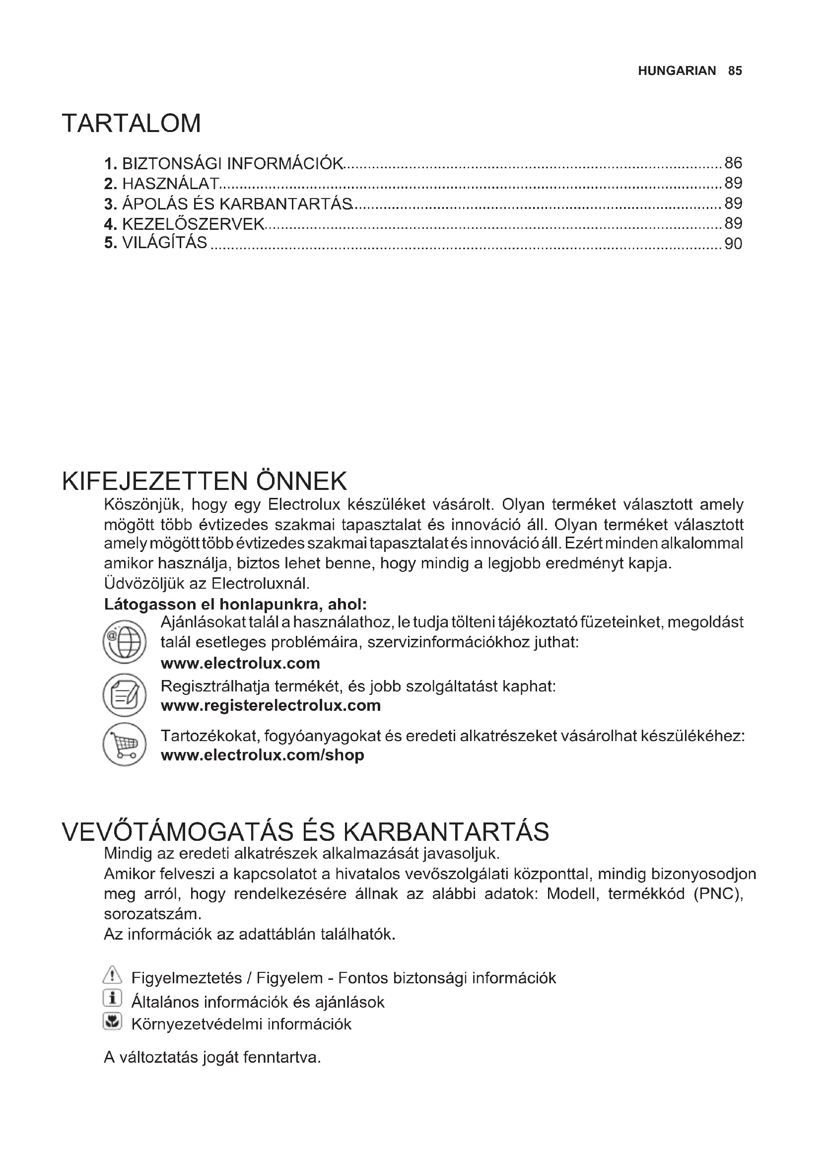 KIFEJEZETTEN ÖNNEK Köszönjük, hogy egy Electrolux készüléket vásárolt. Olyan terméket választott amely mögött több évtizedes szakmai tapasztalat és innováció áll. Olyan terméket választott amely mögött több évtizedes szakmai tapasztalat és innováció áll. Ezért minden alkalommal amikor használja, biztos lehet benne, hogy mindig a legjobb eredményt kapja. Üdvözöljük az Electroluxnál. Látogasson el honlapunkra, ahol: Ajánlásokat talál a használathoz, le tudja tölteni tájékoztató füzeteinket, megoldást talál esetleges problémáira, szervizinformációkhoz juthat: www.electrolux.com Regisztrálhatja termékét, és jobb szolgáltatást kaphat: www.registerelectrolux.com Tartozékokat, fogyóanyagokat és eredeti alkatrészeket vásárolhat készülékéhez: www.electrolux.com/shop VEVŐTÁMOGATÁS ÉS KARBANTARTÁS Mindig az eredeti alkatrészek alkalmazását javasoljuk. Amikor felveszi a kapcsolatot a hivatalos vevőszolgálati központtal, mindig bizonyosodjon meg arról, hogy rendelkezésére állnak az alábbi adatok: Modell, termékkód (PNC), sorozatszám. Az információk az adattáblán találhatók. Figyelmeztetés / Figyelem - Fontos biztonsági információk Általános információk és ajánlások Környezetvédelmi információk A változtatás jogát fenntartva.86 www.electrolux.com