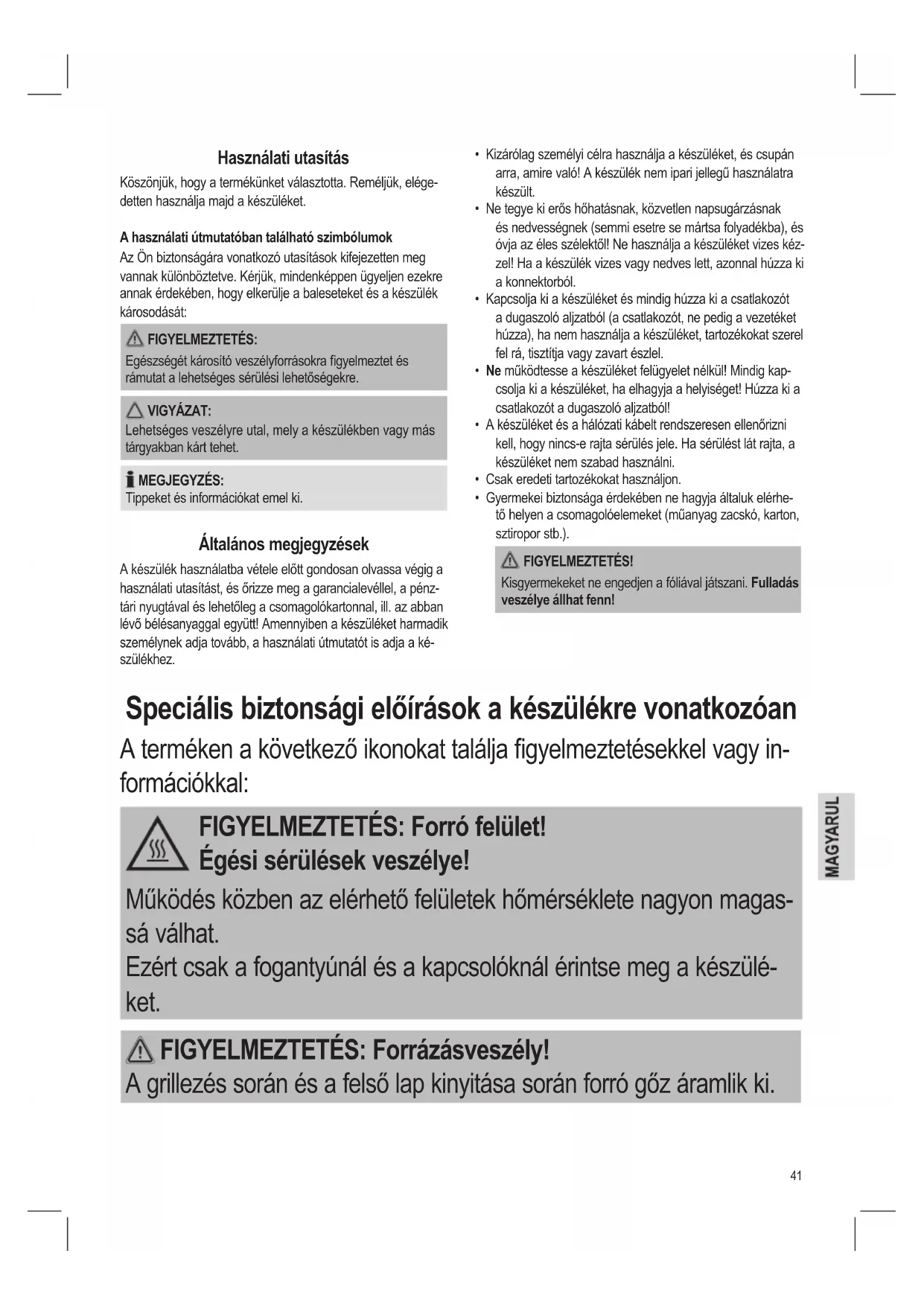 - Gyermekei biztonsága érdekében ne hagyja általuk elérhe- tő helyen a csomagolóelemeket (műanyag zacskó, karton, sztiropor stb.). FIGYELMEZTETÉS! Kisgyermekeket ne engedjen a fóliával játszani. Fulladás veszélye állhat fenn! Használati utasítás Köszönjük, hogy a termékünket választotta. Reméljük, elége- detten használja majd a készüléket. A használati útmutatóban található szimbólumok Az Ön biztonságára vonatkozó utasítások kifejezetten meg vannak különböztetve. Kérjük, mindenképpen ügyeljen ezekre annak érdekében, hogy elkerülje a baleseteket és a készülék károsodását: FIGYELMEZTETÉS: Egészségét károsító veszélyforrásokra gyelmeztet és rámutat a lehetséges sérülési lehetőségekre. VIGYÁZAT: Lehetséges veszélyre utal, mely a készülékben vagy más tárgyakban kárt tehet. MEGJEGYZÉS: Tippeket és információkat emel ki. Általános megjegyzések A készülék használatba vétele előtt gondosan olvassa végig a használati utasítást, és őrizze meg a garancialevéllel, a pénz- tári nyugtával és lehetőleg a csomagolókartonnal, ill. az abban lévő bélésanyaggal együtt! Amennyiben a készüléket harmadik személynek adja tovább, a használati útmutatót is adja a ké- szülékhez. Speciális biztonsági előírások a készülékre vonatkozóan A terméken a következő ikonokat találja gyelmeztetésekkel vagy in- formációkkal: FIGYELMEZTETÉS: Forró felület! Égési sérülések veszélye! Működés közben az elérhető felületek hőmérséklete nagyon magas- sá válhat. Ezért csak a fogantyúnál és a kapcsolóknál érintse meg a készülé- ket. FIGYELMEZTETÉS: Forrázásveszély! A grillezés során és a felső lap kinyitása során forró gőz áramlik ki.42 VIGYÁZAT: Tűzveszély! Az olaj és a zsír túlhevítés esetén meggyulladhat. Tartson elégséges távolságot (15 cm) a gyúlékony tárgyaktól, mint a függöny, bútor stb. VIGYÁZAT: Jelen berendezés tisztítás során nem meríthető vízbe. Kérjük, olvassa el a jelen útmutató “Tisztítás” fejezetében foglalt uta- sításokat.