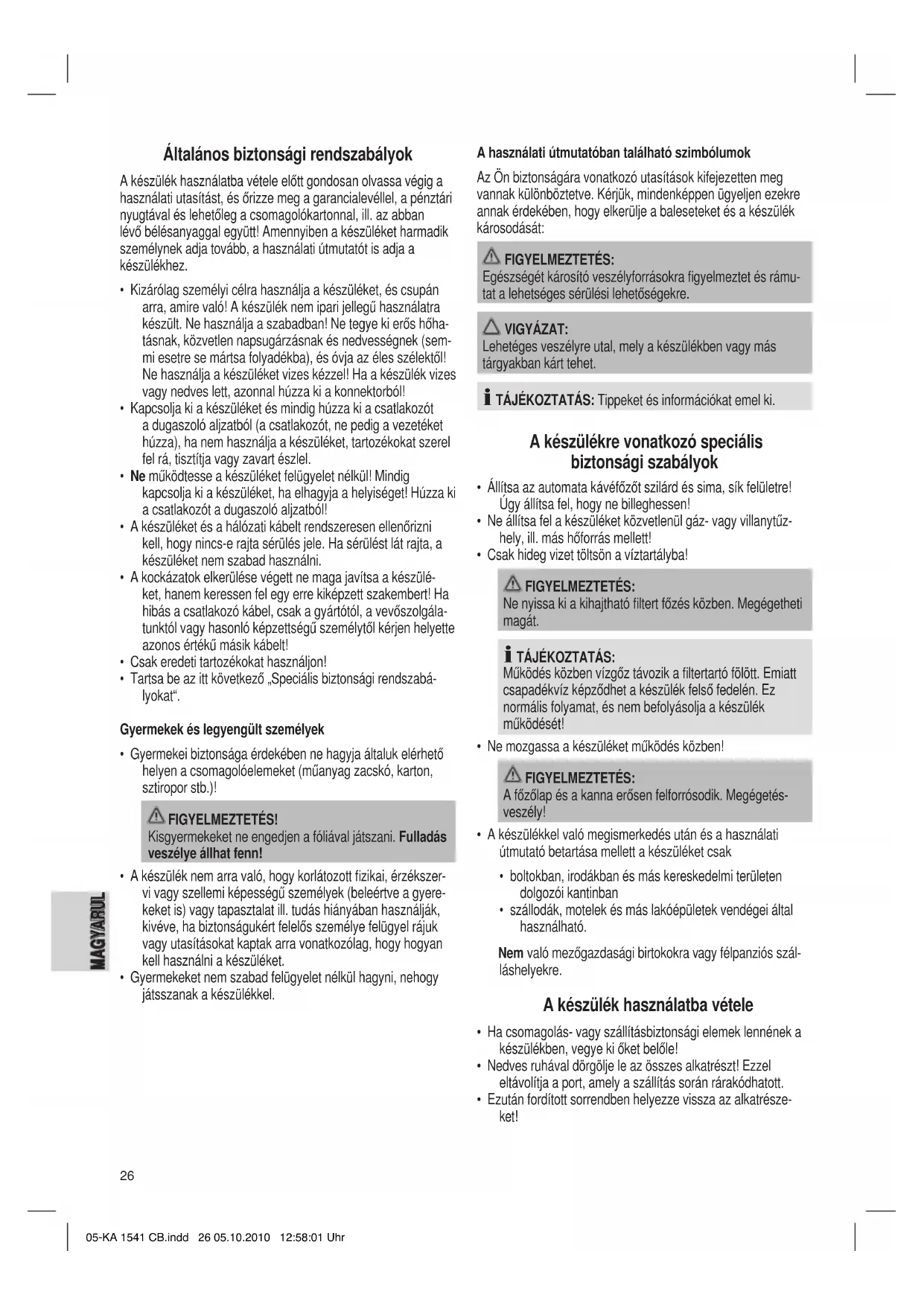 Modell: ........................................................................KA 1541 CB Feszültségellátás: ...................................... 220-240 V ~ 50/60 Hz Teljesítményfelvétel: .....................................................730-870 W Töltési mennyiség: ........................................................... 1,25 liter Védelmi osztály: ........................................................................... Ι Nettó súly: ..........................................................................1,25 kg Ezt a készüléket az Európa Tanács minden vonatkozó aktuális irányelve szerint (pl. elektromágnesesség-elviselő képesség vagy kisfeszültség-elviselő képesség) ellenőriztük, és a legújabb biztonságtechnikai előírások szerint készült. A műszaki változtatások jogát fenntartjuk. 05-KA 1541 CB.indd 27 05.10.2010 12:58:01 Uhr28 MAGyARUL A „kuka“ piktogram jelentése Kímélje környezetünket, az elektromos készülékek nem a háztartási szemétbe valók! Használja az elektromos készülékek ártalmatlanítására kijelölt gyűjtőhelyeket, ott adja le azokat az elektromos készülékeit, amelyeket többé már nem kíván használni! Ezzel segítséget nyújt ahhoz, hogy elkerülhetők legyenek azok a hatások, amelyeket a helytelen „szemétre dobás“ gyakorolhat a környezetre és az emberi egészségre. Ezzel hozzájárul az újrahasznosításhoz, a recyclinghoz és a kiöregedett elektromos és elektronikus készülékek értékesítésé- nek egyéb formáihoz. Az önkormányzatoknál vagy a polgármesteri hivatalokban tájékoztatást kaphat arról, hogy hova viheti a kiselejtezett készülékeket. 05-KA 1541 CB.indd 28 05.10.2010 12:58:01 Uhr29