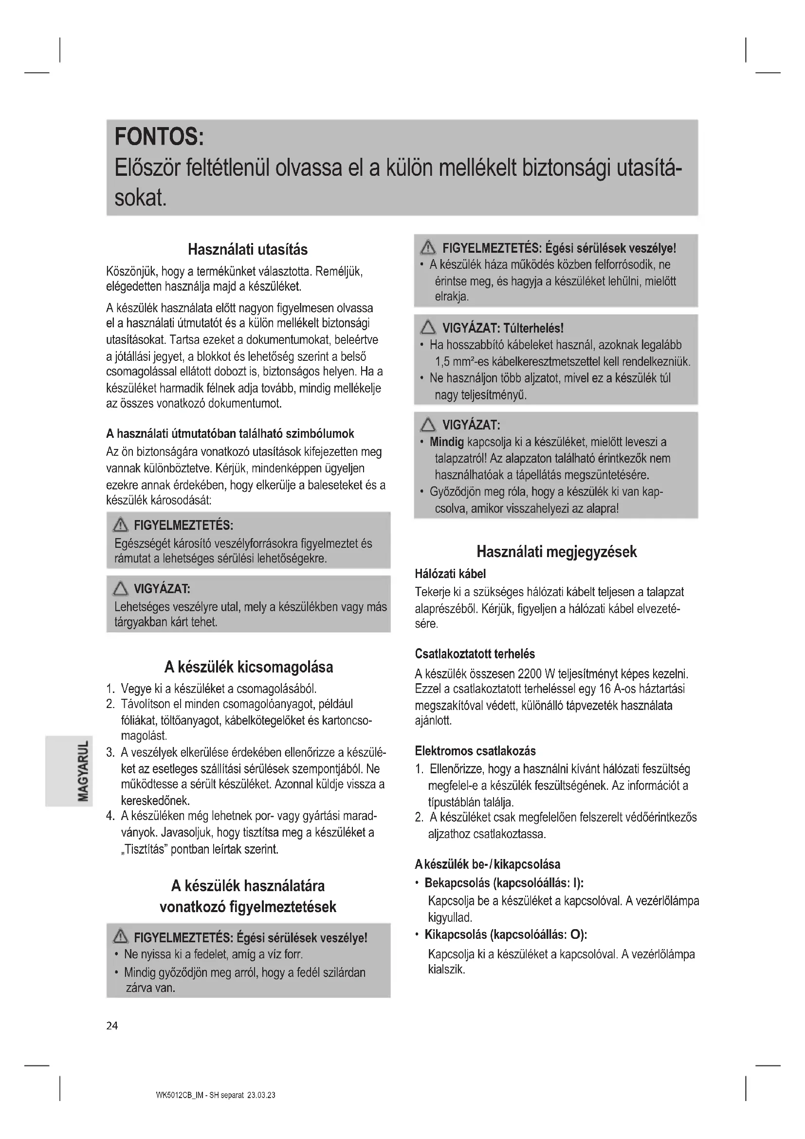 FONTOS: Először feltétlenül olvassa el a külön mellékelt biztonsági utasítá- sokat. Használati utasítás Köszönjük, hogy a termékünket választotta. Reméljük, elégedetten használja majd a készüléket. A készülék használata előtt nagyon gyelmesen olvassa el a használati útmutatót és a külön mellékelt biztonsági utasításokat. Tartsa ezeket a dokumentumokat, beleértve a jótállási jegyet, a blokkot és lehetőség szerint a belső csomagolással ellátott dobozt is, biztonságos helyen. Ha a készüléket harmadik félnek adja tovább, mindig mellékelje az összes vonatkozó dokumentumot. A használati útmutatóban található szimbólumok Az ön biztonságára vonatkozó utasítások kifejezetten meg vannak különböztetve. Kérjük, mindenképpen ügyeljen ezekre annak érdekében, hogy elkerülje a baleseteket és a készülék károsodását: FIGYELMEZTETÉS: Egészségét károsító veszélyforrásokra gyelmeztet és rámutat a lehetséges sérülési lehetőségekre. VIGYÁZAT: Lehetséges veszélyre utal, mely a készülékben vagy más tárgyakban kárt tehet. A készülék kicsomagolása