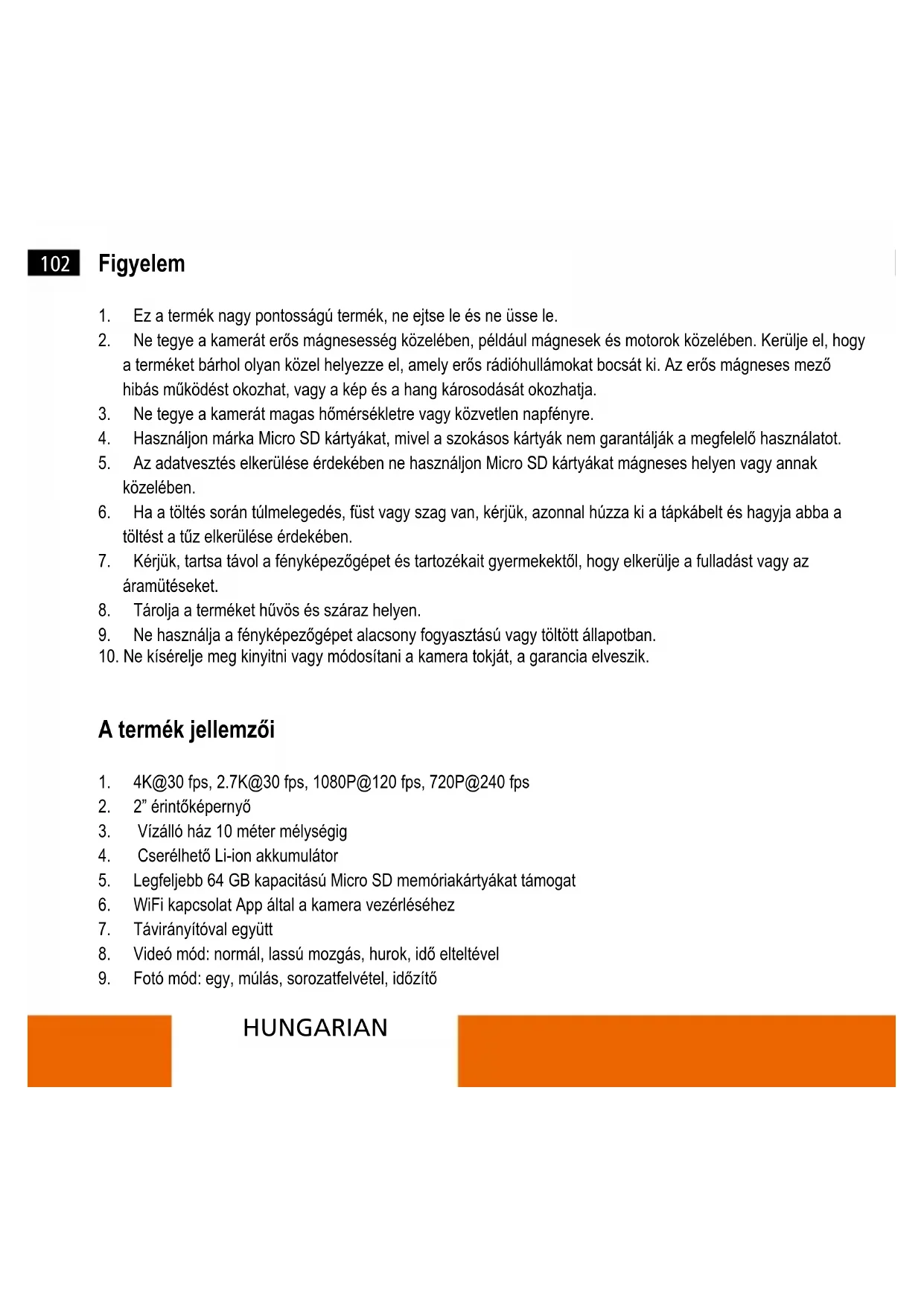 10.Nekíséreljemegkinyitnivagymódosítaniakameratokját,agaranciaelveszik. A termék jellemzői