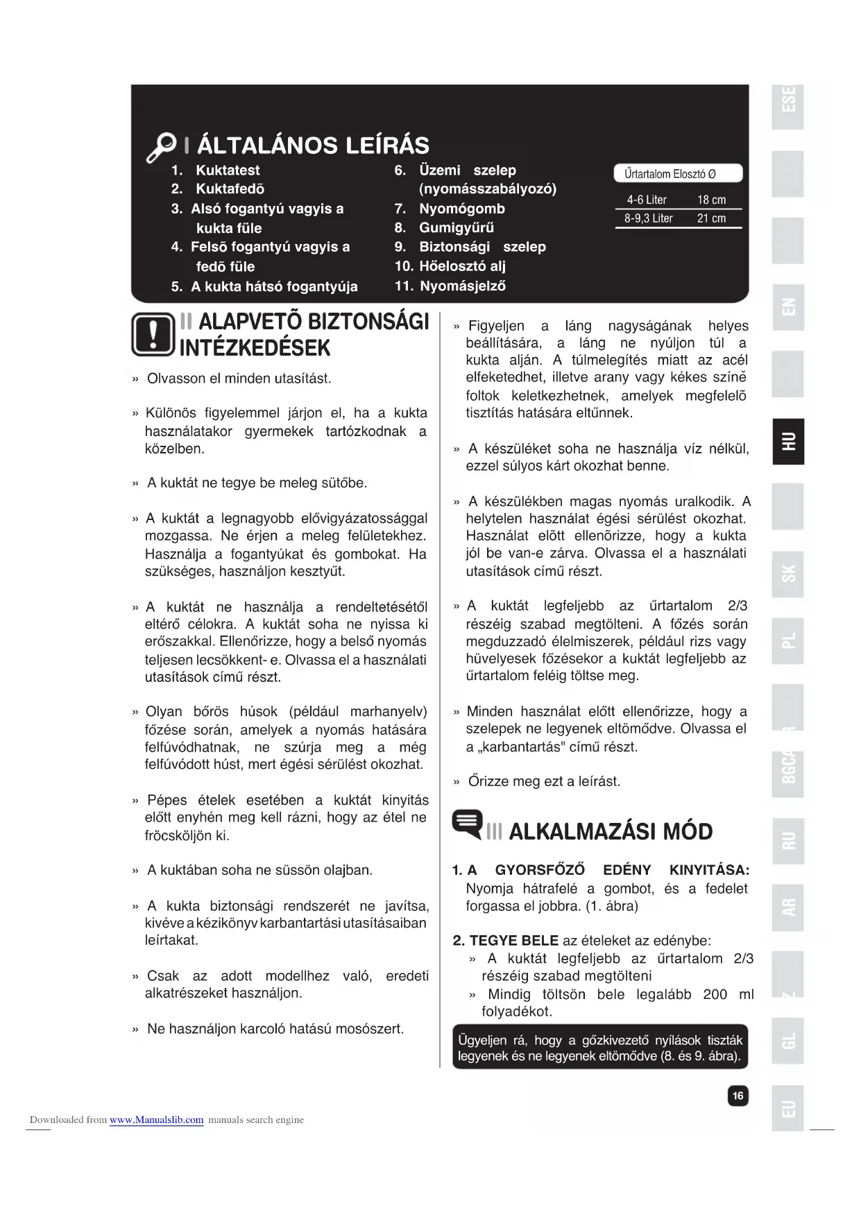 » A kuktát legfeljebb az űrtartalom 2/3 részéig szabad megtölteni » Mindig töltsön bele legalább 200 ml folyadékot. Ügyeljen rá, hogy a gőzkivezető nyílások tiszták legyenek és ne legyenek eltömődve (8. és 9. ábra). Űrtartalom Elosztó Ø4-6 Liter8-9,3 Liter18 cm21 cm » Olvasson el minden utasítást. » Különös fi gyelemmel járjon el, ha a kukta használatakor gyermekek tartózkodnak a közelben. » A kuktát ne tegye be meleg sütőbe. » A kuktát a legnagyobb elővigyázatossággal mozgassa. Ne érjen a meleg felületekhez. Használja a fogantyúkat és gombokat. Ha szükséges, használjon kesztyűt. » A kuktát ne használja a rendeltetésétől eltérő célokra. A kuktát soha ne nyissa ki erőszakkal. Ellenőrizze, hogy a belső nyomás teljesen lecsökkent- e. Olvassa el a használati utasítások című részt. » Olyan bőrös húsok (például marhanyelv) főzése során, amelyek a nyomás hatására felfúvódhatnak, ne szúrja meg a még felfúvódott húst, mert égési sérülést okozhat. » Pépes ételek esetében a kuktát kinyitás előtt enyhén meg kell rázni, hogy az étel ne fröcsköljön ki. » A kuktában soha ne süssön olajban. » A kukta biztonsági rendszerét ne javítsa, kivéve a kézikönyv karbantartási utasításaiban leírtakat. » Csak az adott modellhez való, eredeti alkatrészeket használjon. » Ne használjon karcoló hatású mosószert.