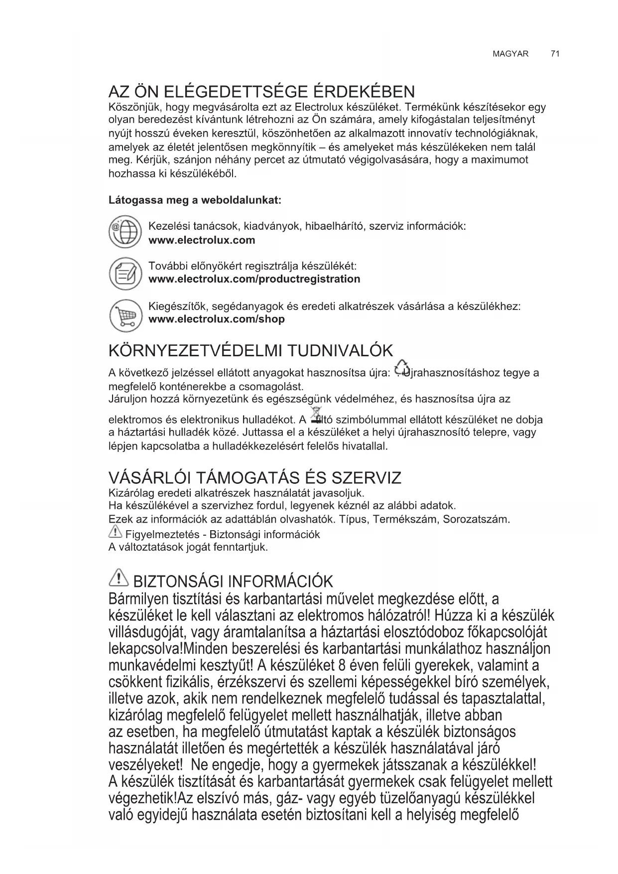 A következő jelzéssel ellátott anyagokat hasznosítsa újra: Újrahasznosításhoz tegye a megfelelő konténerekbe a csomagolást. Járuljon hozzá környezetünk és egészségünk védelméhez, és hasznosítsa újra az elektromos és elektronikus hulladékot A tiltó szimbólummal ellátott készüléket ne dobja a háztartási hulladék közé. Juttassa el a készüléket a helyi újrahasznosító telepre, vagy lépjen kapcsolatba a hulladékkezelésért felelős hivatallal. VÁSÁRLÓI TÁMOGATÁS ÉS SZERVIZ Kizárólag eredeti alkatrészek használatát javasoljuk Ha készülékével a szervizhez fordul, legyenek kéznél az alábbi adatok Ezek az információk az adattáblán olvashatók Típus, Termékszám, Sorozatszám Figyelmeztetés - Biztonsági információk A változtatások jogát fenntartjuk