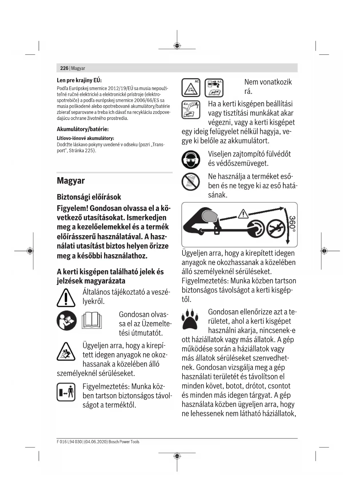 a.c. Nem vonatkozik rá. d.c. Ha a kerti kisgépen beállítási vagy tisztítási munkákat akar végezni, vagy a kerti kisgépet egy ideig felügyelet nélkül hagyja, ve- gye ki belőle az akkumulátort. Viseljen zajtompító fülvédőt és védőszemüveget. Ne használja a terméket eső- ben és ne tegye ki az eső hatá- sának. Ügyeljen arra, hogy a kirepített idegen anyagok ne okozhassanak a közelében álló személyeknél sérüléseket. Figyelmeztetés: Munka közben tartson biztonságos távolságot a kerti kisgép- től. Gondosan ellenőrizze azt a te- rületet, ahol a kerti kisgépet használni akarja, nincsenek-e ott háziállatok vagy más állatok. A gép működése során a háziállatok vagy más állatok sérüléseket szenvedhet- nek. Gondosan vizsgálja meg a gép használati területét és távolítson el minden követ, botot, drótot, csontot és minden más idegen tárgyat. A gép használata közben ügyeljen arra, hogy ne lehessenek nem látható háziállatok, F 016 L94 030 | (04.06.2020) Bosch Power ToolsMagyar | 227 más állatok vagy fatönkök a sűrű gyep alatt. Általános biztonsági előírások az elektromos kéziszerszámok számára u Olvassa el valamennyi biztonsági tájékoztatót, előírást, illusztrációt és adatot, amelyet az elektromos kéziszerszámmal együtt megka- pott. Az alábbiakban felsorolt előírá- sok betartásának elmulasztása áram- ütéshez, tűzhöz és/vagy súlyos testi sérülésekhez vezethet. u Kérjük a későbbi használatra gon- dosan őrizze meg ezeket az előírá- sokat. u Az alább alkalmazott "elektromos ké- ziszerszám" fogalom a hálózati elekt- romos kéziszerszámokat (hálózati csatlakozó kábellel) és az akkumulá- toros elektromos kéziszerszámokat (hálózati csatlakozó kábel nélkül) foglalja magában. Munkahelyi biztonság u Tartsa tisztán és jól megvilágítva a munkaterületet. A zsúfolt vagy sö- tét területeken gyakrabban követ- keznek be balesetek. u Ne dolgozzon a berendezéssel olyan robbanásveszélyes környe- zetben, ahol éghető folyadékok, gázok vagy por vannak. Az elektro- mos kéziszerszámok szikrákat kelte- nek, amelyek a port vagy a gőzöket meggyújthatják. u Tartsa távol a gyerekeket és a né- zelődőket, ha az elektromos kézi- szerszámot használja. Haelvonják a figyelmét, elvesztheti az uralmát a berendezés felett. Elektromos biztonsági előírások u A készülék csatlakozó dugójának bele kell illeszkednie a dugaszoló- aljzatba. A csatlakozó dugót sem- milyen módon sem szabad megvál- toztatni. Védőföldeléssel ellátott készülékek esetében ne használ- jon csatlakozó adaptert. Aváltoz- tatás nélküli csatlakozó dugók és a megfelelő dugaszoló aljzatok csök- kentik az áramütés kockázatát. u Kerülje el a földelt felületekkel va- ló érintkezést, mint például csö- vek, fűtőtestek, kályhák és hűtő- gépek. Az áramütés veszélye meg- növekszik, ha a teste földelve van. u Tartsa távol az elektromos kézi- szerszámot az esőtől és a nedves- ségtől. Ha víz jut be egy elektromos kéziszerszámba, az megnöveli az áramütés veszélyét. u Ne használja a kábelt a rendelteté- sétől eltérő célokra. Sohase vigye vagy húzza az elektromos kézi- szerszámot a kábelnél fogva, vala- mint sose húzza ki a csatlakozót a kábelnél fogva a dugaszoló aljzat- ból. Tartsa távol a kábelt hőforrá- soktól, olajtól, éles sarkoktól és élektől, valamint mozgó gépalkat- részektől. A megrongálódott vagy Bosch Power Tools F 016 L94 030 | (04.06.2020)228 | Magyar csomókkal teli kábel megnöveli az áramütés veszélyét. u Ha egy elektromos kéziszerszám- mal a szabadban dolgozik, csak kültéri hosszabbítót használjon. A kültéri hosszabbító használata csök- kenti az áramütés veszélyét. u Ha nem lehet elkerülni az elektro- mos kéziszerszám nedves környe- zetben való használatát, alkalmaz- zon egy hibaáram-védőkapcsolót. A hibaáram-védőkapcsoló alkalmazá- sa csökkenti az áramütés kockázatát. Személyi biztonság u Munka közben mindig figyeljen, ügyeljen arra, amit csinál és meg- fontoltan dolgozzon az elektromos kéziszerszámmal. Ne használja a berendezést ha fáradt vagy kábító- szer, alkohol vagy gyógyszer hatá- sa alatt áll. Egy pillanatnyi figyelmet- lenség a szerszám használata közben komoly sérülésekhez vezethet. u Viseljen védőfelszerelést. Viseljen mindig védőszemüveget. Avédő- felszerelések, mint a porvédő álarc, csúszásbiztos védőcipő, védősapka és fülvédő megfelelő használata csökkenti a személyi sérülések koc- kázatát. u Kerülje el a készülék akaratlan üzembe helyezését. Győződjön meg arról, hogy az elektromos ké- ziszerszám ki van kapcsolva, mi- előtt beköti az áramforrást és/ vagy az akkumulátort, valamint mielőtt felemelné és vinni kezdené az elektromos kéziszerszámot. Haaz elektromos kéziszerszám fel- emelése közben az ujját a kapcsolón tartja, vagy ha akészüléket bekap- csolt állapotban csatlakoztatja az áramforráshoz, az baleset vezethet. u Az elektromos kéziszerszám be- kapcsolása előtt okvetlenül távo- lítsa el abeállítószerszámokat vagy csavarkulcsokat. Az elektro- mos kéziszerszám forgó részeiben felejtett beállítószerszám vagy csa- varkulcs sérüléseket okozhat. u Ne becsülje túl önmagát. Ügyeljen arra, hogy mindig biztosan álljon és az egyensúlyát megtartsa. Így az elektromos kéziszerszám felett vá- ratlan helyzetekben is jobban tud uralkodni. u Viseljen megfelelő ruházatot. Ne viseljen bő ruhát vagy ékszereket. Tartsa távol a haját és a ruháját a mozgó részektől. A bő ruhát, az ék- szereket és a hosszú hajat a szer- szám mozgó részei magukkal ránt- hatják. u Ha az elektromos kéziszerszámra fel lehet szerelni a por elszívásá- hoz és összegyűjtéséhez szüksé- ges b