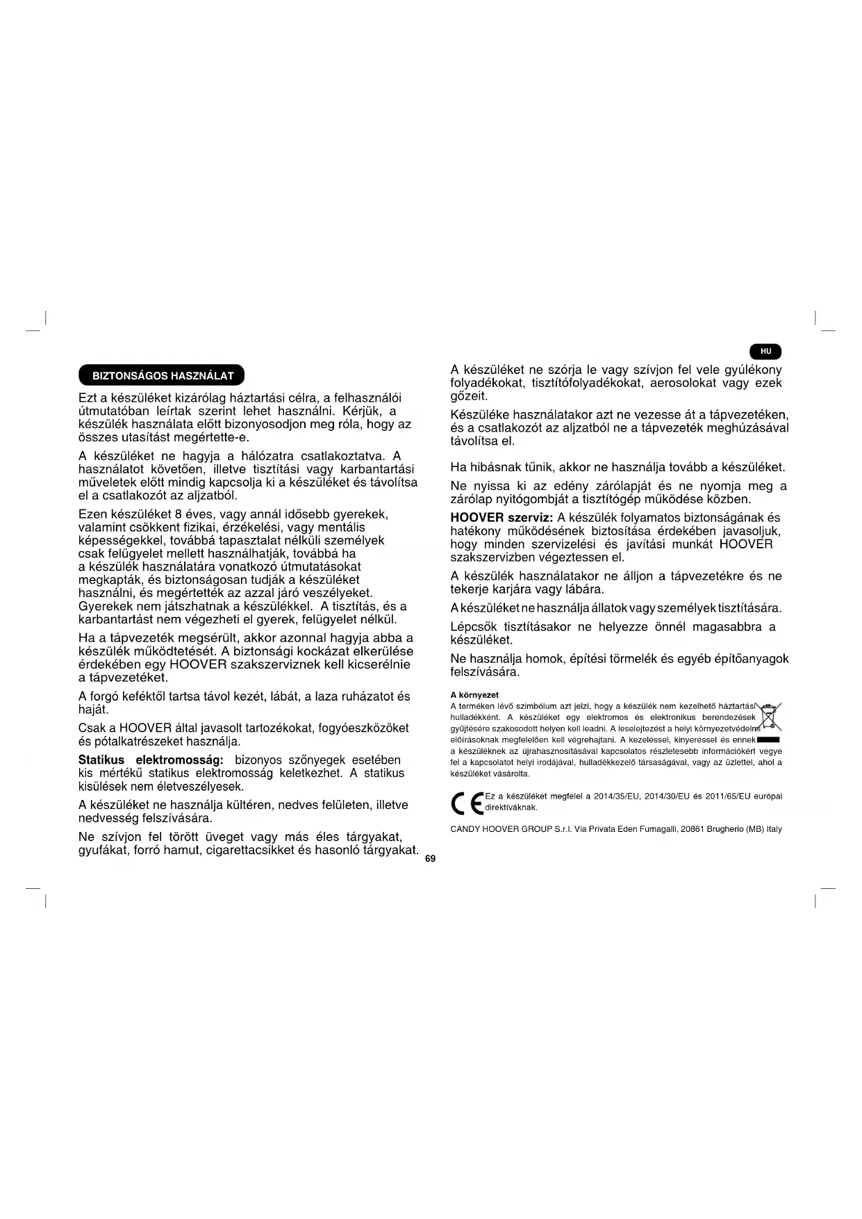 Ezt a készüléket kizárólag háztartási célra, a felhasználói útmutatóban leírtak szerint lehet használni. Kérjük, a készülék használata előtt bizonyosodjon meg róla, hogy az összes utasítást megértette-e. A készüléket ne hagyja a hálózatra csatlakoztatva. A használatot követően, illetve tisztítási vagy karbantartási műveletek előtt mindig kapcsolja ki a készüléket és távolítsa el a csatlakozót az aljzatból. Ezen készüléket 8 éves, vagy annál idősebb gyerekek, valamint csökkent zikai, érzékelési, vagy mentális képességekkel, továbbá tapasztalat nélküli személyek csak felügyelet mellett használhatják, továbbá ha a készülék használatára vonatkozó útmutatásokat megkapták, és biztonságosan tudják a készüléket használni, és megértették az azzal járó veszélyeket. Gyerekek nem játszhatnak a készülékkel. A tisztítás, és a karbantartást nem végezheti el gyerek, felügyelet nélkül. Ha a tápvezeték megsérült, akkor azonnal hagyja abba a készülék működtetését. A biztonsági kockázat elkerülése érdekében egy HOOVER szakszerviznek kell kicserélnie a tápvezetéket. A forgó keféktől tartsa távol kezét, lábát, a laza ruházatot és haját. Csak a HOOVER által javasolt tartozékokat, fogyóeszközöket és pótalkatrészeket használja. Statikus elektromosság: bizonyos szőnyegek esetében kis mértékű statikus elektromosság keletkezhet. A statikus kisülések nem életveszélyesek. A készüléket ne használja kültéren, nedves felületen, illetve nedvesség felszívására. Ne szívjon fel törött üveget vagy más éles tárgyakat, gyufákat, forró hamut, cigarettacsikket és hasonló tárgyakat. A készüléket ne szórja le vagy szívjon fel vele gyúlékony folyadékokat, tisztítófolyadékokat, aerosolokat vagy ezek gőzeit. Készüléke használatakor azt ne vezesse át a tápvezetéken, és a csatlakozót az aljzatból ne a tápvezeték meghúzásával távolítsa el. Ha hibásnak tűnik, akkor ne használja tovább a készüléket. Ne nyissa ki az edény zárólapját és ne nyomja meg a zárólap nyitógombját a tisztítógép működése közben. HOOVER szerviz: A készülék folyamatos biztonságának és hatékony működésének biztosítása érdekében javasoljuk, hogy minden szervizelési és javítási munkát HOOVER szakszervizben végeztessen el. A készülék használatakor ne álljon a tápvezetékre és ne tekerje karjára vagy lábára. A készüléket ne használja állatok vagy személyek tisztítására. Lépcsők tisztításakor ne helyezze önnél magasabbra a készüléket. Ne használja homok, építési törmelék és egyéb építőanyagok felszívására. A környezet A terméken lévő szimbólum azt jelzi, hogy a készülék nem kezelhető háztartási hulladékként. A készüléket egy elektromos és elektronikus berendezések gyűjtésére szakosodott helyen kell leadni. A leselejtezést a helyi környezetvédelmi előírásoknak megfelelően kell végrehajtani. A kezeléssel, kinyeréssel és ennek a készüléknek az újrahasznosításával kapcsolatos részletesebb információkért vegye fel a kapcsolatot helyi irodájával, hulladékkezelő társaságával, vagy az üzlettel, ahol a készüléket vásárolta. Ez a készüléket megfelel a 2014/35/EU, 2014/30/EU és 2011/65/EU európai direktíváknak. CANDY HOOVER GROUP S.r.l. Via Privata Eden Fumagalli, 20861 Brugherio (MB) Italy HU70 A. Kapcsolópedál B. Motor előtti szűrő burkolata C. Edény fogantyúja D. Belső edényház E. Edény zárólapjának nyitógombja F. Megtelt edény mechanikus érzékelő G. Tömlővég reteszének gombja H. Tömlő