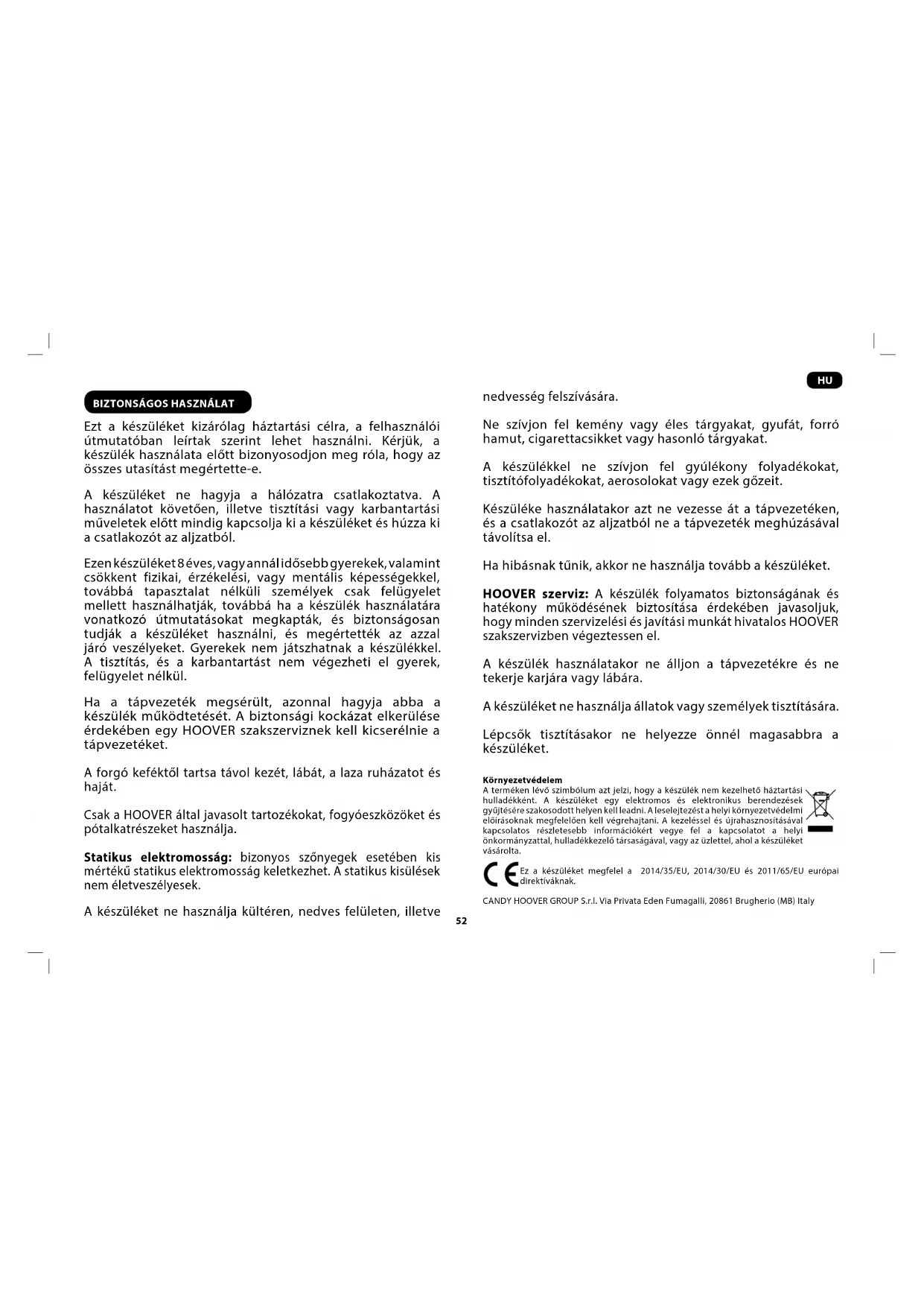 Ezt a készüléket kizárólag háztartási célra, a felhasználói útmutatóban leírtak szerint lehet használni. Kérjük, a készülék használata előtt bizonyosodjon meg róla, hogy az összes utasítást megértette-e. A készüléket ne hagyja a hálózatra csatlakoztatva. A használatot követően, illetve tisztítási vagy karbantartási műveletek elő tt mindig kapcsolja ki a készüléket és húzza ki a csatlakozót az aljzatból. Ezen készüléket 8 éves, vagy annál idősebb gyerekek, valamint csökkent fizikai, érzékelési, vagy mentális képességekkel, továbbá tapasztalat nélküli személyek csak felügyelet mellett használhatják, továbbá ha a készülék használatára vonatkozó útmutatásokat megkapták, és biztonságosan tudják a készüléket használni, és megértették az azzal járó veszélyeket. Gyerekek nem játszhatnak a készülékkel. A tisztítás, és a karbantartást nem végezheti el gyerek, felügyelet nélkül. Ha a tápvezeték megsérült, azonnal hagyja abba a készülék működtetését. A biztonsági kockázat elkerülése érdekében egy HOOVER szakszerviznek kell kicserélnie a tápvezetéket. A forgó keféktől tartsa távol kezét, lábát, a laza ruházatot és haját. Csak a HOOVER által javasolt tartozékokat, fogyóeszközöket és pótalkatrészeket használja. Statikus elektromosság: bizonyos szőnyegek esetében kis mértékű statikus elektromosság keletkezhet. A statikus kisülések nem életveszélyesek. A készüléket ne használja kültéren, nedves felületen, illetve nedvesség felszívására. Ne szívjon fel kemény vagy éles tárgyakat, gyufát, forró hamut, cigarettacsikket vagy hasonló tárgyakat. A készülékkel ne szívjon fel gyúlékony folyadékokat, tisztítófolyadékokat, aerosolokat vagy ezek gőzeit. Készüléke használatakor azt ne vezesse át a tápvezetéken, és a csatlakozót az aljzatból ne a tápvezeték meghúzásával távolítsa el. Ha hibásnak tűnik, akkor ne használja tovább a készüléket. HOOVER szerviz: A készülék folyamatos biztonságának és hatékony működésének biztosítása érdekében javasoljuk, hogy minden szervizelési és javítási munkát hivatalos HOOVER szakszervizben végeztessen el. A készülék használatakor ne álljon a tápvezetékre és ne tekerje karjára vagy lábára. A készüléket ne használja állatok vagy személyek tisztítására. Lépcsők tisztításakor ne helyezze önnél magasabbra a készüléket. Környezetvédelem A terméken lévő szimbólum azt jelzi, hogy a készülék nem kezelhető háztartási hulladékként. A készüléket egy elektromos és elektronikus berendezések gyűjtésére szakosodott helyen kell leadni. A leselejtezést a helyi környezetvédelmi előírásoknak megfelelően kell végrehajtani. A kezeléssel és újrahasznosításával kapcsolatos részletesebb információkért vegye fel a kapcsolatot a helyi önkormányzattal, hulladékkezelő társaságával, vagy az üzlettel, ahol a készüléket vásárolta. Ez a készüléket megfelel a 2014/35/EU, 2014/30/EU és 2011/65/EU európai direktíváknak. CANDY HOOVER GROUP S.r.l. Via Privata Eden Fumagalli, 20861 Brugherio (MB) Italy