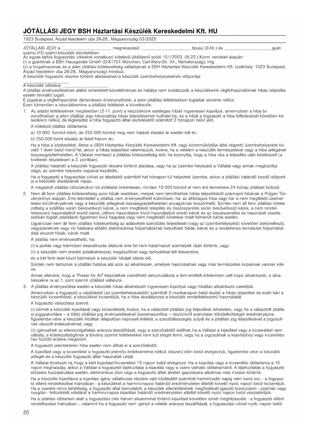 A készülék vételára: ____________________ A jótállás érvényesítésének alább ismertetett követelményei és hatálya nem korlátozzák a készülékeink végfelhasználóinak hibás teljesítés esetén fennálló jogait. E jogaikat a végfelhasználók díjmentesen érvényesíthetik, a jelen jótállási feltételekben foglaltak sérelme nélkül. Ezen túlmenően a készülékeinkre a jótállási feltételek a következők: 1. Az alábbi feltételeknek megfelelően (2-11. pont) a készülékünk esetleges hibáit ingyenesen kijavítjuk, amennyiben a hiba bi- zonyíthatóan a jelen jótállási jegy kibocsátója hibás teljesítésének tudható be, és a hibát a fogyasztó a hiba felfedezését követően ké- sedelem nélkül, de legkésőbb a hiba fogyasztó általi észlelésétől számított 2 hónapon belül jelzi. A kötelező jótállás időtartama a) 10000 forintot elérő, de 250000forintot meg nem haladó eladási ár esetén két év, b) 250000forint eladási ár felett három év.. Ha a hiba a kézbesítést, illetve a (BSH Háztartási Készülék Kereskedelmi Kft. vagy közreműködője által végzett) üzembehelyezést kö- vető 1 éven belül merül fel, akkor a hibás teljesítést vélelmezzük, kivéve, ha e vélelem a készülék természetével vagy a hiba jellegével összeegyeztethetetlen. A Vállalat mentesül a jótállási kötelezettség alól, ha bizonyítja, hogy a hiba oka a teljesítés után keletkezett (a kivételek részletesen a 2. pontban). A jótállási határidő a készülék fogyasztó részére történő átadása, vagy ha az üzembe helyezést a Vállalat vagy annak megbízottja végzi, az üzembe helyezés napjával kezdődik. Ha a fogyasztó a fogyasztási cikket az átadástól számított hat hónapon túl helyezteti üzembe, akkor a jótállási határidő kezdő időpont- ja a készülék átadásának napja. A megadott jótállási időszakokon túl aVállalat önkéntesen, minden 10000forintot el nem érő termékére 24 hónap jótállást biztosít. 2. Nem áll fenn jótállási kötelezettség azon hibák esetében, melyek nem tekinthetőek hibás teljesítésből származó hibának a Polgári Tör- vénykönyv alapján. Erre tekintettel a jótállás nem érvényesíthető különösen, ha: az állítólagos hiba vagy kár a nem megfelelő üzemel- tetési körülményeknek vagy a készülék jellegével összeegyeztethetetlen anyagoknak köszönhető. Szintén nem áll fenn jótállási kötele- zettség a szállítás során bekövetkező károk, a nem megfelelő telepítés és összeszerelés során bekövetkező károk, a nem rendel- tetésszerű használatból eredő károk, otthoni használaton kívüli használatból eredő károk és az összeszerelési és használati utasítá- sokban foglalt utasítások figyelmen kívül hagyása vagy nem megfelelő követése miatt felmerült károk esetén. Ugyancsak nem áll fenn jótállási kötelezettség az adásvételi szerződés teljesítését (vagy az üzembehelyezést) követően bekövetkező, vegyszereknek vagy víz hatására előálló elektrokémiai folyamatoknak betudható hibák, károk és a rendellenes természeti folyamatok által okozott hibák, károk miatt. A jótállás nem érvényesíthető, ha: (i) a javítás vagy bármilyen beavatkozás általunk erre fel nem hatalmazott személyek útján történik, vagy (ii) a készülék nem eredeti pótalkatrésszel, kiegészítővel vagy tartozékkal lett felszerelve, és a két fenti eset közül bármelyik a készülék hibáját idézte elő. Szintén nem tartoznak a jótállás hatálya alá azok az alkatrészek, amelyek használatnak vagy más természetes kopásnak vannak kité- ve. Annak ellenére, hogy a "Power for All" készülékek cserélhető akkumulátorai a fent említett értelemben vett kopó alkatrészek, e alka- trészekre ra az 1. pont szerinti jótállást vállalunk. 3. A jótállás érvényesítése esetén a készülék hibás alkatrészeit ingyenesen kijavítjuk vagy hibátlan alkatrészre cseréljük. Amennyiben a fogyasztó a vásárlástól (az üzembehelyezéstől) számított 3 munkanapon belül észleli a hibás teljesítést és ezért kéri a készülék kicserélését, a készüléket kicseréljük, ha a hiba akadályozza a készülék rendeltetésszerű használatát. A fogyasztó választása szerint: (i) kérheti a készülék kijavítását vagy kicserélését, kivéve, ha a választott jótállási jog teljesítése lehetetlen, vagy ha a választott jótállá- si joggyakorlása – a többi jótállási jog érvényesítésével összehasonlítva – részünkről aránytalan többletköltséget eredményezne, figyelembe véve a készülék hibátlan állapotban képviselt értékét, a szerződésszegés súlyát és a jótállási jog teljesítésével a jogosult- nak okozott érdeksérelmet, vagy (ii) igényelheti az ellenszolgáltatás arányos leszállítását, vagy a szerződéstől elállhat, ha a Vállalat a kijavítást vagy a kicserélést nem vállalta, e kötelezettségének a törvény szerinti feltételekkel nem tud eleget tenni, vagy ha a jogosultnak a kijavításhoz vagy kicserélés- hez fűződő érdeke megszűnt. A fogyasztó jelentéktelen hiba esetén nem állhat el a szerződéstől. A kijavítást vagy a kicserélést a fogyasztó jelentős érdeksérelme nélkül, ésszerű időn belül elvégezzük, figyelembe véve a készülék jellegét és a készülék fogyasztó általi használati célját. A Vállalat törekszik rá, hogy a kért kijavítást/kicserélést 15 napon belül elvégezze. Ha a kijavítás vagy a kicserélés időtartama a 15 napot meghaladja, akkor a Vállalat a fogyasztót tájékoztatja a kijavítás vagy a csere várható időtartamáról. A tájékoztatás a fogyasztó előzetes hozzájárulása esetén, elektronikus úton vagy a fogyasztó általi átvétel igazolására alkalmas más módon törté