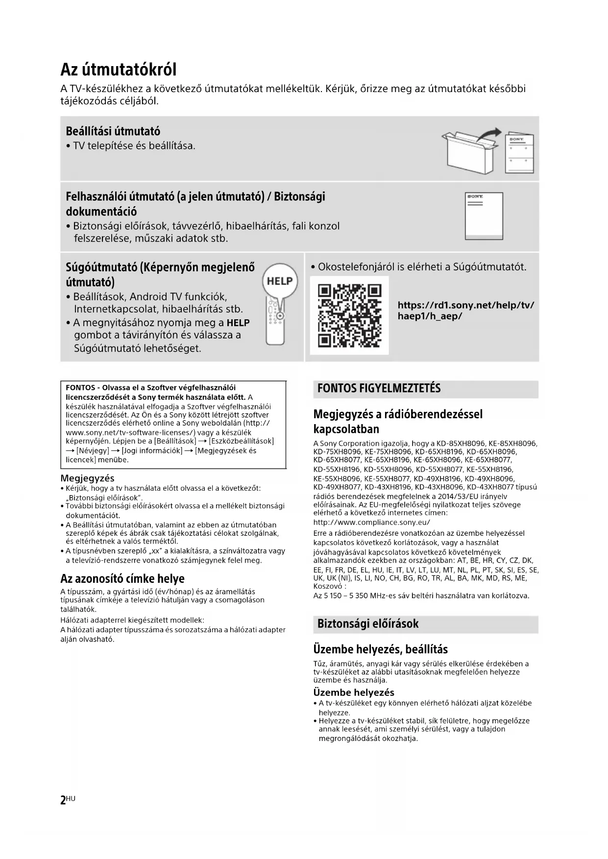 - Okostelefonjáról is elérheti a Súgóútmutatót. https://rd1.sony.net/help/tv/ haep1/h_aep/ FONTOS - Olvassa el a Szoftver végfelhasználói licencszerződését a Sony termék használata előtt. A készülék használatával elfogadja a Szoftver végfelhasználói licencszerződését. Az Ön és a Sony között létrejött szoftver licencszerződés elérhető online a Sony weboldalán (http:// www.sony.net/tv-software-licenses/) vagy a készülék képernyőjén. Lépjen be a [Beállítások] [Eszközbeállítások] [Névjegy] [Jogi információk] [Megjegyzések és licencek] menübe.