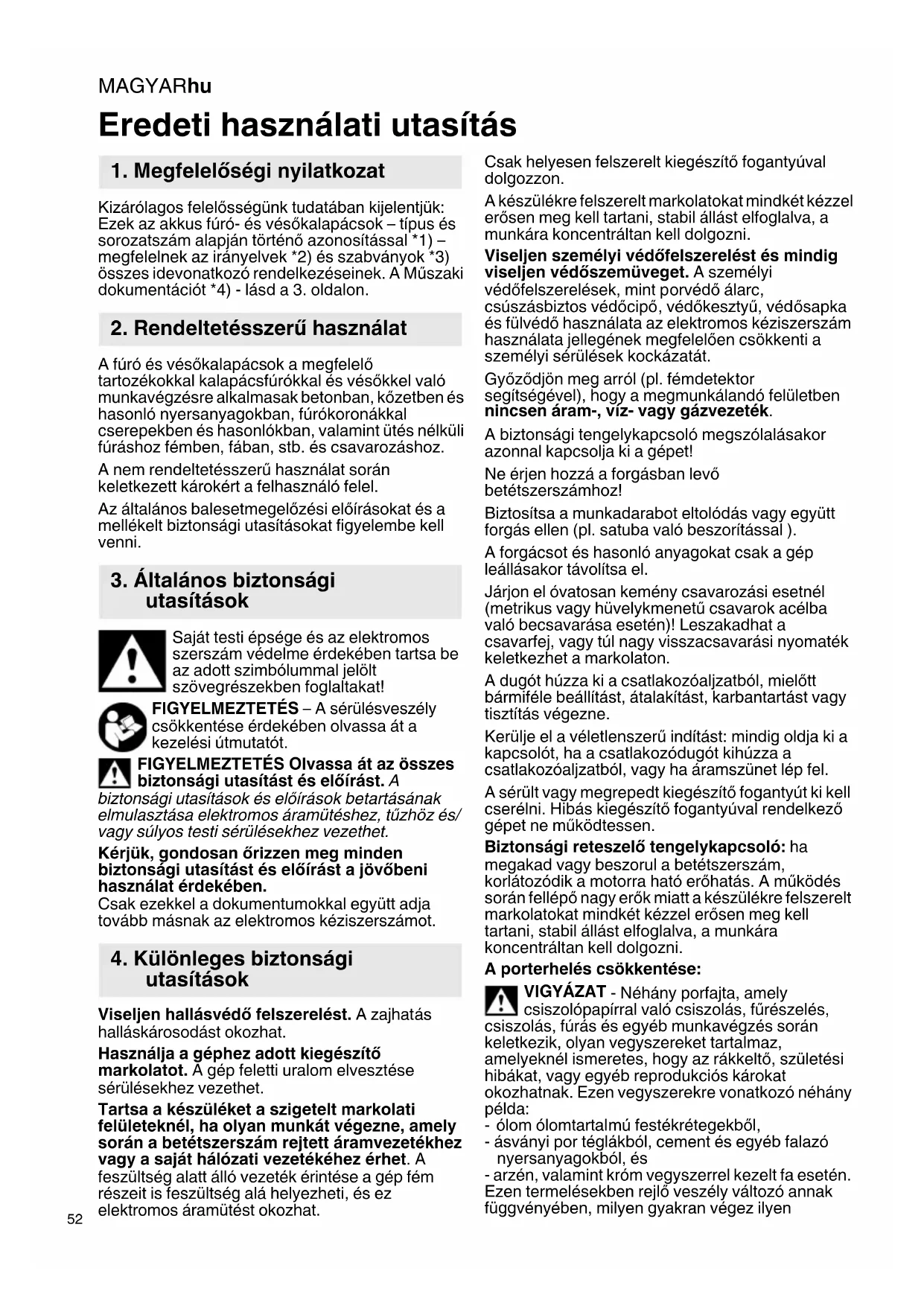 Kizárólagos felelősségünk tudatában kijelentjük: Ezek az akkus fúró- és vésőkalapácsok – típus és sorozatszám alapján történő azonosítással *1) – megfelelnek az irányelvek *2) és szabványok *3) összes idevonatkozó rendelkezéseinek. A Műszaki dokumentációt *4) - lásd a 3. oldalon. A fúró és vésőkalapácsok a megfelelő tartozékokkal kalapácsfúrókkal és vésőkkel való munkavégzésre alkalmasak betonban, kőzetben és hasonló nyersanyagokban, fúrókoronákkal cserepekben és hasonlókban, valamint ütés nélküli fúráshoz fémben, fában, stb. és csavarozáshoz. A nem rendeltetésszerű használat során keletkezett károkért a felhasználó felel. Az általános balesetmegelőzési előírásokat és a mellékelt biztonsági utasításokat figyelembe kell venni. Saját testi épsége és az elektromos szerszám védelme érdekében tartsa be az adott szimbólummal jelölt szövegrészekben foglaltakat! FIGYELMEZTETÉS – A sérülésveszély csökkentése érdekében olvassa át a kezelési útmutatót. FIGYELMEZTETÉS Olvassa át az összes biztonsági utasítást és előírást. A biztonsági utasítások és előírások betartásának elmulasztása elektromos áramütéshez, tűzhöz és/ vagy súlyos testi sérülésekhez vezethet. Kérjük, gondosan őrizzen meg minden biztonsági utasítást és előírást a jövőbeni használat érdekében. Csak ezekkel a dokumentumokkal együtt adja tovább másnak az elektromos kéziszerszámot. Viseljen hallásvédő felszerelést. A zajhatás halláskárosodást okozhat. Használja a géphez adott kiegészítő markolatot. A gép feletti uralom elvesztése sérülésekhez vezethet. Tartsa a készüléket a szigetelt markolati felületeknél, ha olyan munkát végezne, amely során a betétszerszám rejtett áramvezetékhez vagy a saját hálózati vezetékéhez érhet. A feszültség alatt álló vezeték érintése a gép fém részeit is feszültség alá helyezheti, és ez elektromos áramütést okozhat. Csak helyesen felszerelt kiegészítő fogantyúval dolgozzon. A készülékre felszerelt markolatokat mindkét kézzel erősen meg kell tartani, stabil állást elfoglalva, a munkára koncentráltan kell dolgozni. Viseljen személyi védőfelszerelést és mindig viseljen védőszemüveget. A személyi védőfelszerelések, mint porvédő álarc, csúszásbiztos védőcipő, védőkesztyű, védősapka és fülvédő használata az elektromos kéziszerszám használata jellegének megfelelően csökkenti a személyi sérülések kockázatát. Győződjön meg arról (pl. fémdetektor segítségével), hogy a megmunkálandó felületben nincsen áram-, víz- vagy gázvezeték. A biztonsági tengelykapcsoló megszólalásakor azonnal kapcsolja ki a gépet! Ne érjen hozzá a forgásban levő betétszerszámhoz! Biztosítsa a munkadarabot eltolódás vagy együtt forgás ellen (pl. satuba való beszorítással ). A forgácsot és hasonló anyagokat csak a gép leállásakor távolítsa el. Járjon el óvatosan kemény csavarozási esetnél (metrikus vagy hüvelykmenetű csavarok acélba való becsavarása esetén)! Leszakadhat a csavarfej, vagy túl nagy visszacsavarási nyomaték keletkezhet a markolaton. A dugót húzza ki a csatlakozóaljzatból, mielőtt bármiféle beállítást, átalakítást, karbantartást vagy tisztítás végezne. Kerülje el a véletlenszerű indítást: mindig oldja ki a kapcsolót, ha a csatlakozódugót kihúzza a csatlakozóaljzatból, vagy ha áramszünet lép fel. A sérült vagy megrepedt kiegészítő fogantyút ki kell cserélni. Hibás kiegészítő fogantyúval rendelkező gépet ne működtessen. Biztonsági reteszelő tengelykapcsoló: ha megakad vagy beszorul a betétszerszám, korlátozódik a motorra ható erőhatás. A működés során fellépő nagy erők miatt a készülékre felszerelt markolatokat mindkét kézzel erősen meg kell tartani, stabil állást elfoglalva, a munkára koncentráltan kell dolgozni. A porterhelés csökkentése: VIGYÁZAT - Néhány porfajta, amely csiszolópapírral való csiszolás, fűrészelés, csiszolás, fúrás és egyéb munkavégzés során keletkezik, olyan vegyszereket tartalmaz, amelyeknél ismeretes, hogy az rákkeltő, születési hibákat, vagy egyéb reprodukciós károkat okozhatnak. Ezen vegyszerekre vonatkozó néhány példa: - ólom ólomtartalmú festékrétegekből, - ásványi por téglákból, cement és egyéb falazó nyersanyagokból, és - arzén, valamint króm vegyszerrel kezelt fa esetén. Ezen termelésekben rejlő veszély változó annak függvényében, milyen gyakran végez ilyen Eredeti használati utasítás