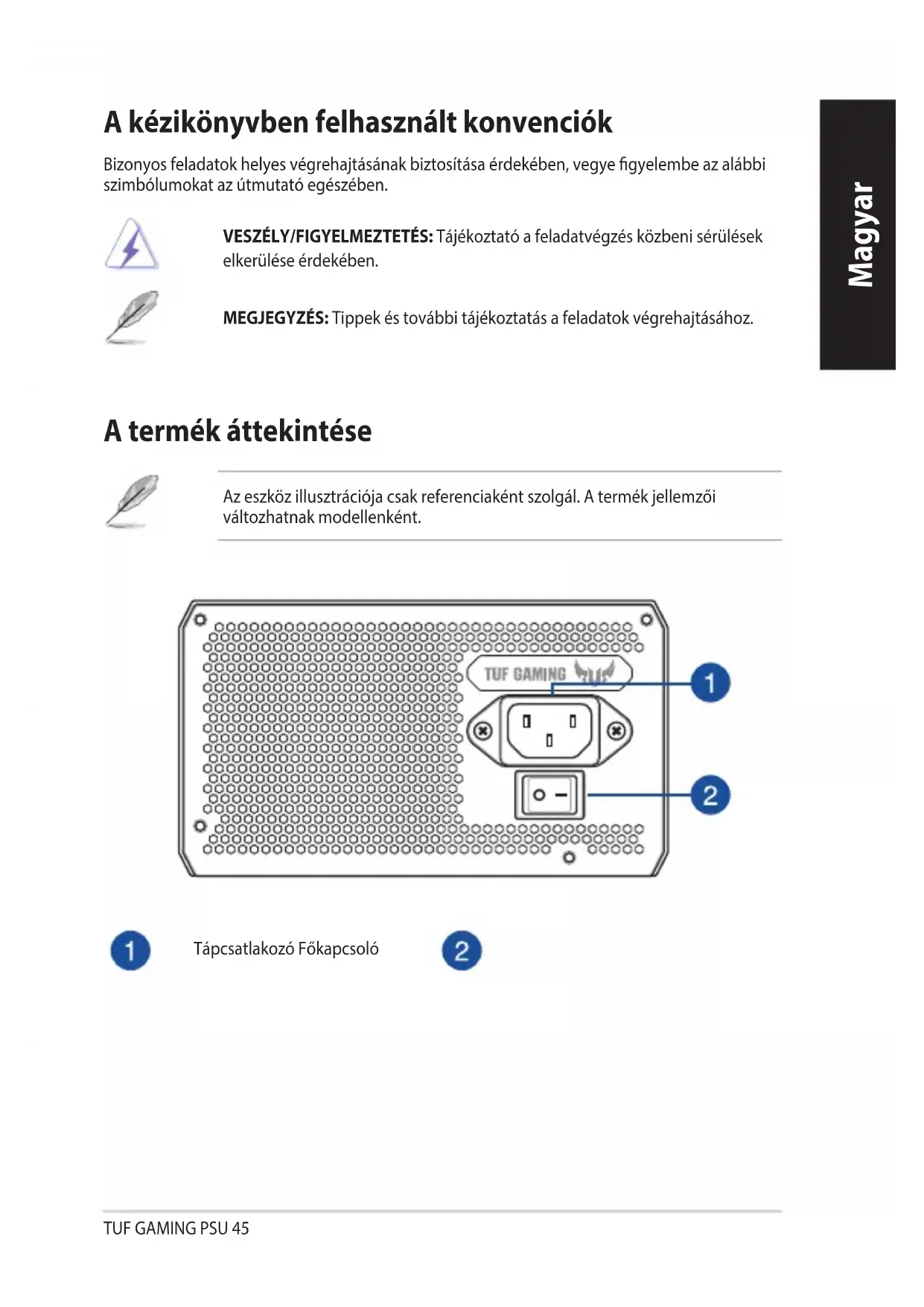 - Η μη συμμόρφωση με τις οδηγίες του κατασκευαστή και με οποιαδήποτε από τις οδηγίες ασφαλείας θα ακυρώσει αμέσως όλες τις εγγυήσεις. R45625 RoHSTUF GAMING PSU 45 Magyar Magyar A kézikönyvben felhasznált konvenciók Bizonyos feladatok helyes végrehajtásának biztosítása érdekében, vegye gyelembe az alábbi szimbólumokat az útmutató egészében. VESZÉLY/FIGYELMEZTETÉS: Tájékoztató a feladatvégzés közbeni sérülések elkerülése érdekében. MEGJEGYZÉS: Tippek és további tájékoztatás a feladatok végrehajtásához. A termék áttekintése Az eszköz illusztrációja csak referenciaként szolgál. A termék jellemzői változhatnak modellenként. Tápcsatlakozó FőkapcsolóTUF GAMING PSU46 Magyar Kábelek szerelése vagy eltávolítása előtt győződjön meg, hogy a rendszer ki van kapcsolva és a rendszer minden tápkábele és minden csatlakoztatott eszköz ki van húzva.