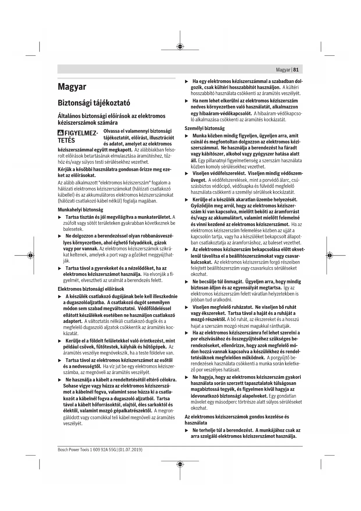 Az ezen utasításokban megadott rezgésszint és zajkibocsátá- si érték egy szabványban rögzített mérési módszerrel került meghatározásra és az elektromos kéziszerszámok egymással való összehasonlítására alkalmazható. Ez az érték a rezgés- és zajkibocsátás ideiglenes becslésére is alkalmas. A megadott rezgésszint és zajkibocsátási érték az elektro- mos kéziszerszám fő alkalmazásaira vonatkozik. Ha az elekt- romos kéziszerszámot más alkalmazásokra, eltérő betétszer- számokkal vagy nem kielégítő karbantartás mellett használ- ják, a rezgésszint és a zajkibocsátási érték a fenti értékektől eltérhet. Ez az egész munkaidőre vonatkozó rezgés- és zajki- bocsátást lényegesen megnövelheti. A rezgés- és zajkibocsátás pontos megbecsüléséhez figye- lembe kell venni azokat az időszakokat is, amikor a készülék kikapcsolt állapotban van, vagy amikor be van ugyan kap- csolva, de nem kerül ténylegesen használatra. Ez az egész munkaidőre vonatkozó rezgés- és zajkibocsátást lényegesen csökkentheti. Hozzon kiegészítő biztonsági intézkedéseket a kezelőnek a rezgések hatása elleni védelmére, például: Az elektromos ké- Bosch Power Tools 1 609 92A 55G | (01.07.2019)84 | Magyar ziszerszám és a betétszerszámok karbantartása, a kezek me- legen tartása, a munkamenetek megszervezése. Összeszerelés u Az elektromos kéziszerszámon végzendő bármely munka megkezdése előtt húzza ki a csatlakozó dugót a dugaszolóaljzatból. Pótfogantyú (lásd a Aábrát) u Az elektromos kéziszerszámát csak a (8) pótfogantyú- val együtt használja. Forgassa el a (7) szárnyascsavart az óramutató járásával el- lenkező irányba és vezesse rá a (8) pótfogantyút a kívánt helyzetben a fúrótokmányon keresztül az elektromos kézi- szerszám orsónyakára. A (8)pótfogantyút a biztonságos és fáradságmentes munká- hoz megfelelő helyzetbe lehet forgatni. Állítsa be a (8)pótfogantyút a kívánt helyzetbe és az óramu- tató járásával megegyező irányba forgatva húzza meg ismét szorosra a (7)szárnyascsavart. u Minden munkamegkezdése előtt gondoskodjon arról, hogy a szárnyascsavar szorosan meg legyen húzva. Ha elveszti az uralmát a berendezés felett, az sérülésekhez vezethet. A furatmélység beállítása A (9)mélységi ütközővel be lehet állítani a kívánt X furat- mélységet. Oldja ki a mélységi ütköző beállító (6) szárnyascsavarját és helyezze bele a mélységi ütközőt a (8)pótfogantyúba. A (9)mélységi ütköző recézett részének felfelé kell mutat- nia. Húzza ki annyaira a mélységi ütközőt, hogy a fúrófej csúcsa és a mélységi ütköző csúcsa közötti távolság megfeleljen az X kívánt furatmélységnek. Húzza meg ismét szorosra az mélységi ütköző beállítására szolgáló (6)szárnyascsavart. Szerszámcsere u A szerszámcseréhez viseljen védőkesztyűt. A fúrótok- mány hosszabb munkaműveletek során erősen felmeleg- szik. Fogaskoszorús fúrótokmány (lásd a Bábrát) Nyissa ki forgatással a (1)fogaskoszorús fúrótokmányt, amíg be lehet tenni a szerszámot. Tegye be a szerszámot. Dugja be a (11)tokmánykulcsot a (1)fogaskoszorús fúró- tokmány megfelelő furataiba és egyenletesen beszorítva rög- zítse a szerszámot. Csavarozó szerszámok (lásd a Cábrát) A (12) csavarozóbetétek alkalmazása esetén használjon mindig egy (13) univerzális bittartót. Mindig csak a csavar- fejhez illő csavarozóbetéteket használjon. A csavarozásho állítsa mindig át a (2) „Fúrás/Ütvefúrás“ át- kapcsolót a „Fúrás“ jelére. A fúrótokmány kicserélése A fúróorsó-reteszelés nélküli elektromos kéziszerszámoknál a fúrótokmányt egy erre feljogosított Bosch elektromos kézi- szerszám szervizzel kell kicseréltetni. A fúrótokmányt kb. 30 – 35Nm meghúzási nyo- matékkal szorosan meg kell húzni. Por- és forgácselszívás Az ólomtartalmú festékrétegek, egyes fafajták, ásványok és fémek pora egészségkárosító hatású lehet. A poroknak a ke- zelő vagy a közelben tartózkodó személyek által történő megérintése vagy belégzése allergikus reakciókhoz és/vagy a légutak megbetegedését vonhatja maga után. Egyes faporok, például tölgy- és bükkfaporok rákkeltő hatá- súak, főleg ha a faanyag kezeléséhez más anyagok is vannak bennük (kromát, favédő vegyszerek). A készülékkel azbesz- tet tartalmazó anyagokat csak szakembereknek szabad meg- munkálniuk. – Gondoskodjon a munkahely jó szellőztetéséről. – Ehhez a munkához célszerű egy P2 szűrőosztályú porvé- dő álarcot használni. A feldolgozásra kerülő anyagokkal kapcsolatban tartsa be az adott országban érvényes előírásokat. u Gondoskodjon arról, hogy a munkahelyén ne gyűlhes- sen össze por. A porok könnyen meggyulladhatnak. Üzemeltetés Üzembe helyezés u Ügyeljen a helyes hálózati feszültségre! Az áramforrás feszültségének meg kell egyeznie az elektromos kézi- szerszám típustábláján található adatokkal. A 230V‑os berendezéseket 220V hálózati feszültségről is szabad üzemeltetni. A forgásirány beállítása (lásd a D – E ábrát) u A(5) forgásirány-átkapcsolót csak álló elektromos ké- ziszerszám esetén kapcsolja át. A (5) forgásirány-átkapcsoló az elektromos kéziszerszám forgásirányának megváltoztatására szolgál. Ha a (4) be-/ki- kapcsoló be van nyomva, akkor a forgásirányt nem lehet át- kapcsolni. Jobbra forgás: Fúráshoz és csavarok behajtásához tolja el balra ütközésig a (5) forgásirány átkapcsolót. Balra forgás: Csavarok és anyák meglazításához, illetve ki- hajtásához tolja el ütközésig jobbra a (5) forgásirány-átkap- csolót. Az üzemmód beállítása Fúrás és csavarozás Állítsa a (2) átkapcsolót a „Fúrás“ jelére. Ütvefúrás Állítsa a (