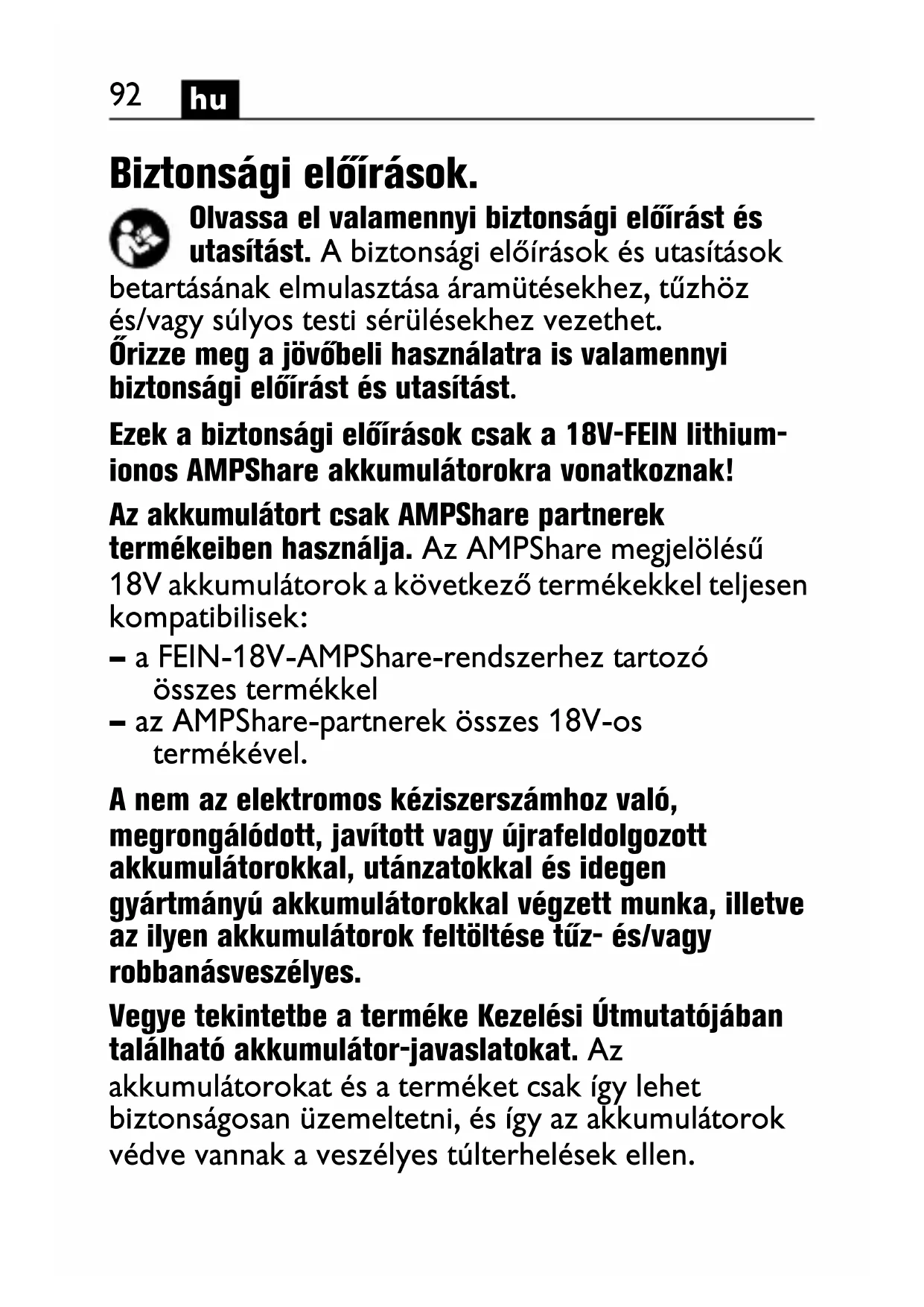Biztonsági előírások. Olvassa el valamennyi biztonsági előírást és utasítást. A biztonsági előírások és utasítások betartásának elmulasztása áramütésekhez, tűzhöz és/vagy súlyos testi sérülésekhez vezethet. Őrizze meg a jövőbeli használatra is valamennyi biztonsági előírást és utasítást. Ezek a biztonsági előírások csak a 18V-FEIN lithium- ionos AMPShare akkumulátorokra vonatkoznak! Az akkumulátort csak AMPShare partnerek termékeiben használja. Az AMPShare megjelölésű 18V akkumulátorok a következő termékekkel teljesen kompatibilisek: – a FEIN-18V-AMPShare-rendszerhez tartozó összes termékkel – az AMPShare-partnerek összes 18V-os termékével. A nem az elektromos kéziszerszámhoz való, megrongálódott, javított vagy újrafeldolgozott akkumulátorokkal, utánzatokkal és idegen gyártmányú akkumulátorokkal végzett munka, illetve az ilyen akkumulátorok feltöltése tűz- és/vagy robbanásveszélyes. Vegye tekintetbe a terméke Kezelési Útmutatójában található akkumulátor-javaslatokat. Az akkumulátorokat és a terméket csak így lehet biztonságosan üzemeltetni, és így az akkumulátorok védve vannak a veszélyes túlterhelések ellen.93