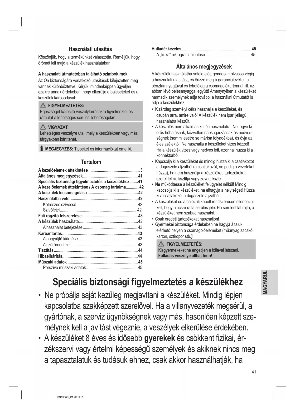 | Biztons e1g | Ne haszn e1lja nedves fel fcletre, haszn e1lat ut e1n h faz e1rja le |