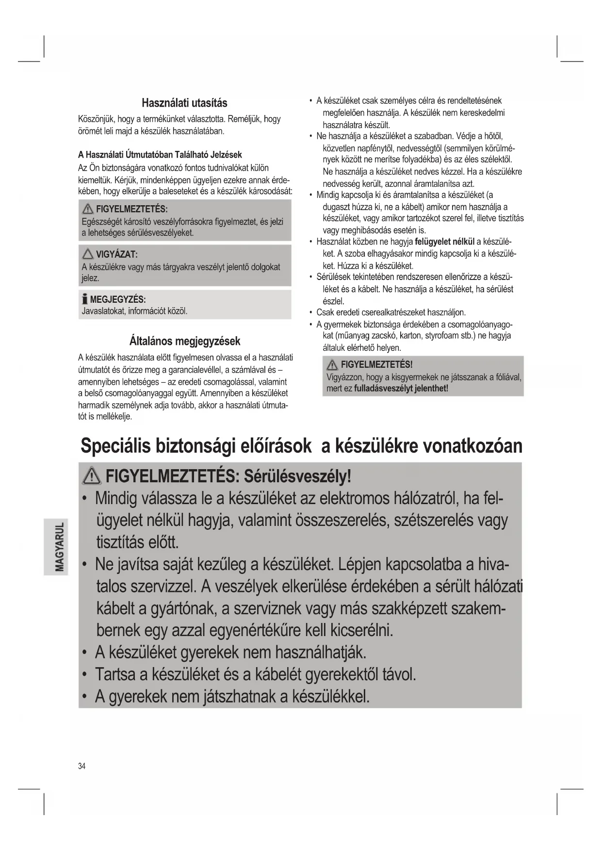 - A gyermekek biztonsága érdekében a csomagolóanyago- kat (műanyag zacskó, karton, styrofoam stb.) ne hagyja általuk elérhető helyen. FIGYELMEZTETÉS! Vigyázzon, hogy a kisgyermekek ne játsszanak a fóliával, mert ez fulladásveszélyt jelenthet! Speciális biztonsági előírások a készülékre vonatkozóan FIGYELMEZTETÉS: Sérülésveszély!