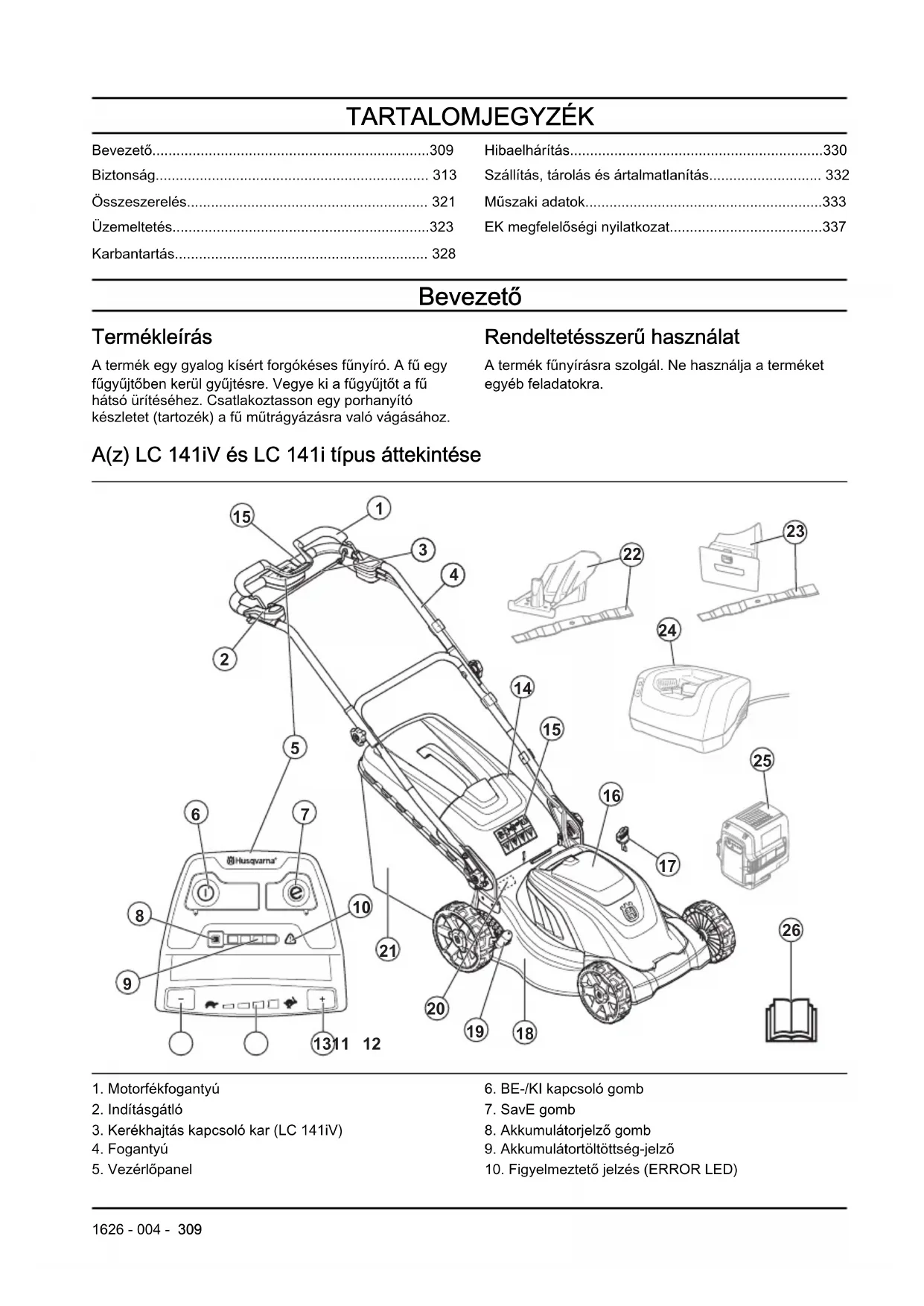 - EK megfelelőségi nyilatkozat Bevezető Termékleírás A termék egy gyalog kísért forgókéses fűnyíró. A fű egy fűgyűjtőben kerül gyűjtésre. Vegye ki a fűgyűjtőt a fű hátsó ürítéséhez. Csatlakoztasson egy porhanyító készletet (tartozék) a fű műtrágyázásra való vágásához. Rendeltetésszerű használat A termék fűnyírásra szolgál. Ne használja a terméket egyéb feladatokra. A(z) LC 141iV és LC 141i típus áttekintése p. 337