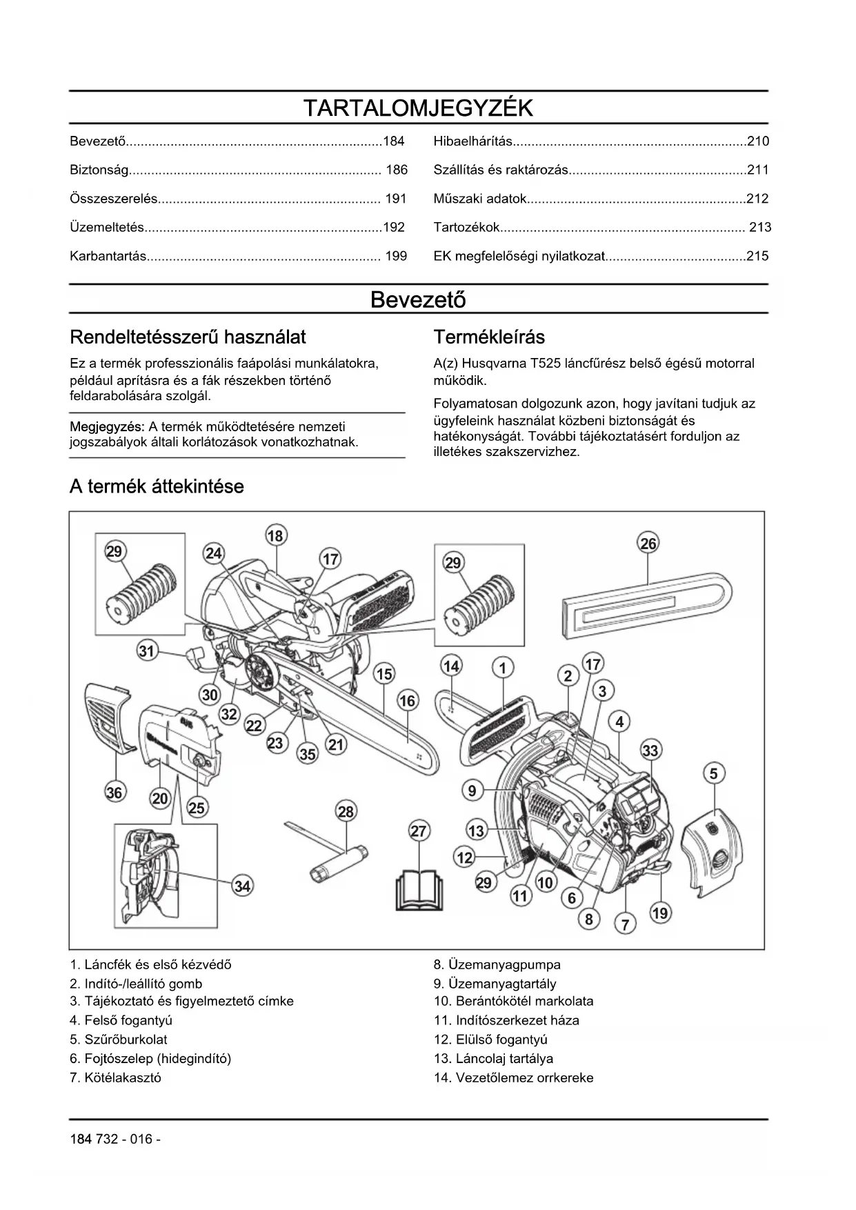 - EK megfelelőségi nyilatkozat Bevezető Rendeltetésszerű használat Ez a termék professzionális faápolási munkálatokra, például aprításra és a fák részekben történő feldarabolására szolgál. Megjegyzés: A termék működtetésére nemzeti jogszabályok általi korlátozások vonatkozhatnak. Termékleírás A(z) Husqvarna T525 láncfűrész belső égésű motorral működik. Folyamatosan dolgozunk azon, hogy javítani tudjuk az ügyfeleink használat közbeni biztonságát és hatékonyságát. További tájékoztatásért forduljon az illetékes szakszervizhez. A termék áttekintése p. 215