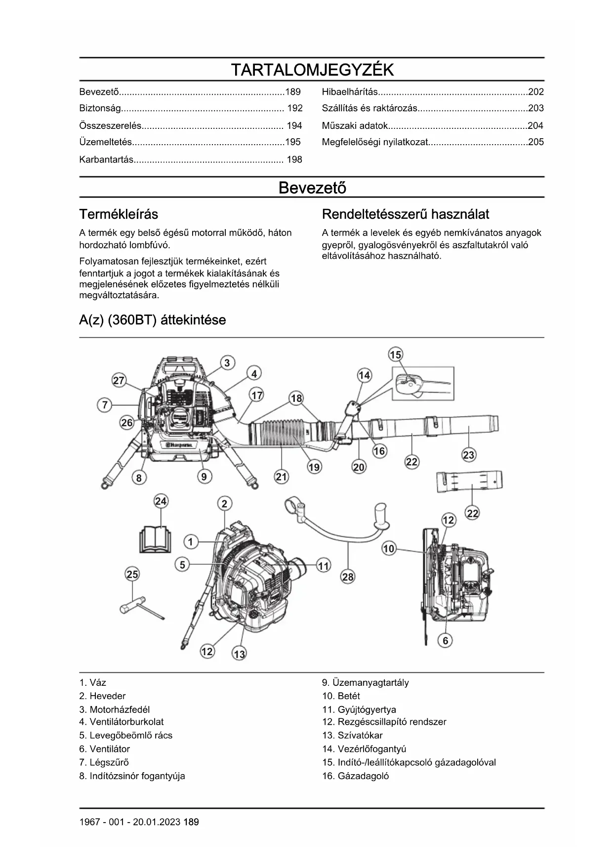 - Megfelelőségi nyilatkozat Bevezető Termékleírás A termék egy belső égésű motorral működő, háton hordozható lombfúvó. Folyamatosan fejlesztjük termékeinket, ezért fenntartjuk a jogot a termékek kialakításának és megjelenésének előzetes figyelmeztetés nélküli megváltoztatására. Rendeltetésszerű használat A termék a levelek és egyéb nemkívánatos anyagok gyepről, gyalogösvényekről és aszfaltutakról való eltávolításához használható. A(z) (360BT) áttekintése p. 205