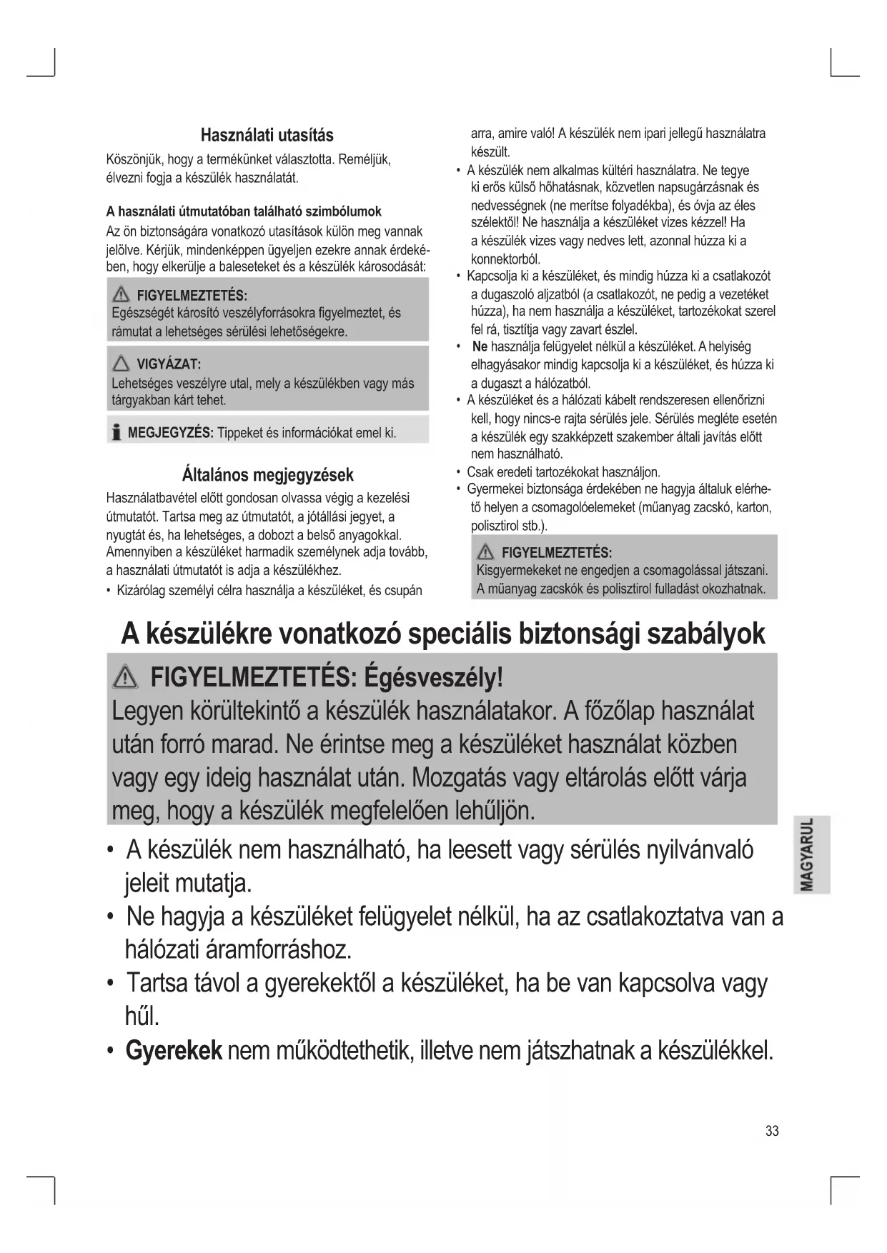 - Gyermekei biztonsága érdekében ne hagyja általuk elérhe- tő helyen a csomagolóelemeket (műanyag zacskó, karton, polisztirol stb.). FIGYELMEZTETÉS: Kisgyermekeket ne engedjen a csomagolással játszani. A műanyag zacskók és polisztirol fulladást okozhatnak. A készülékre vonatkozó speciális biztonsági szabályok FIGYELMEZTETÉS: Égésveszély! Legyen körültekintő a készülék használatakor. A főzőlap használat után forró marad. Ne érintse meg a készüléket használat közben vagy egy ideig használat után. Mozgatás vagy eltárolás előtt várja meg, hogy a készülék megfelelően lehűljön.