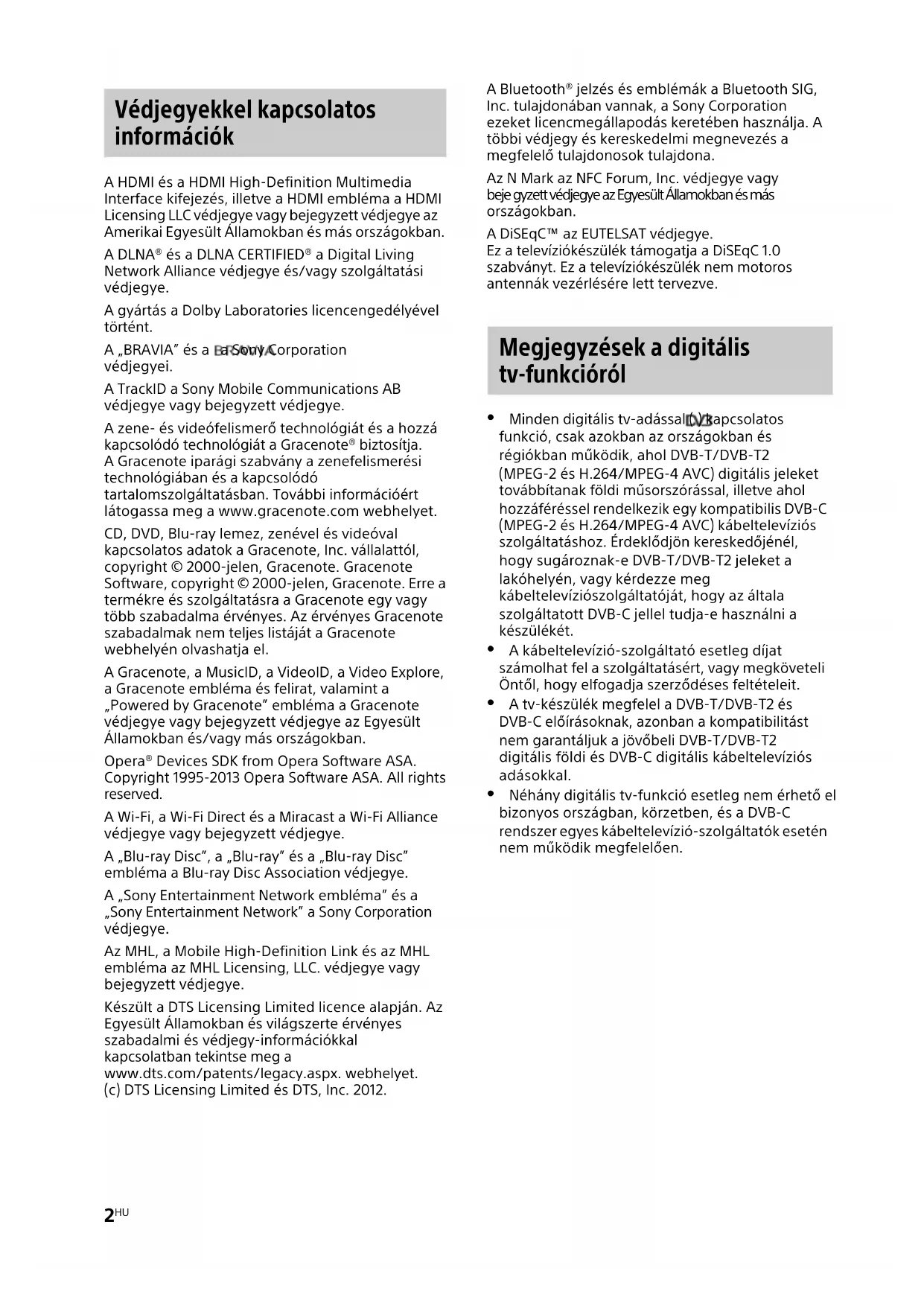 A HDMI és a HDMI High-Definition Multimedia Interface kifejezés, illetve a HDMI embléma a HDMI Licensing LLC védjegye vagy bejegyzett védjegye az Amerikai Egyesült Államokban és más országokban. A DLNA® és a DLNA CERTIFIED® a Digital Living Network Alliance védjegye és/vagy szolgáltatási védjegye. A gyártás a Dolby Laboratories licencengedélyével történt. A „BRAVIA” és a a Sony Corporation védjegyei. A TrackID a Sony Mobile Communications AB védjegye vagy bejegyzett védjegye. A zene- és videófelismerő technológiát és a hozzá kapcsolódó technológiát a Gracenote® biztosítja. A Gracenote iparági szabvány a zenefelismerési technológiában és a kapcsolódó tartalomszolgáltatásban. További információért látogassa meg a www.gracenote.com webhelyet. CD, DVD, Blu-ray lemez, zenével és videóval kapcsolatos adatok a Gracenote, Inc. vállalattól, copyright © 2000-jelen, Gracenote. Gracenote Software, copyright © 2000-jelen, Gracenote. Erre a termékre és szolgáltatásra a Gracenote egy vagy több szabadalma érvényes. Az érvényes Gracenote szabadalmak nem teljes listáját a Gracenote webhelyén olvashatja el. A Gracenote, a MusicID, a VideoID, a Video Explore, a Gracenote embléma és felirat, valamint a „Powered by Gracenote” embléma a Gracenote védjegye vagy bejegyzett védjegye az Egyesült Államokban és/vagy más országokban. Opera® Devices SDK from Opera Software ASA. Copyright 1995-2013 Opera Software ASA. All rights reserved. A Wi-Fi, a Wi-Fi Direct és a Miracast a Wi-Fi Alliance védjegye vagy bejegyzett védjegye. A „Blu-ray Disc”, a „Blu-ray” és a „Blu-ray Disc” embléma a Blu-ray Disc Association védjegye. A „Sony Entertainment Network embléma” és a „Sony Entertainment Network” a Sony Corporation védjegye. Az MHL, a Mobile High-Definition Link és az MHL embléma az MHL Licensing, LLC. védjegye vagy bejegyzett védjegye. Készült a DTS Licensing Limited licence alapján. Az Egyesült Államokban és világszerte érvényes szabadalmi és védjegy-információkkal kapcsolatban tekintse meg a www.dts.com/patents/legacy.aspx. webhelyet. (c) DTS Licensing Limited és DTS, Inc. 2012. A Bluetooth® jelzés és emblémák a Bluetooth SIG, Inc. tulajdonában vannak, a Sony Corporation ezeket licencmegállapodás keretében használja. A többi védjegy és kereskedelmi megnevezés a megfelelő tulajdonosok tulajdona. Az N Mark az NFC Forum, Inc. védjegye vagy beje gyzett védjegye az Egyesült Államokban és más országokban. A DiSEqC™ az EUTELSAT védjegye. Ez a televíziókészülék támogatja a DiSEqC 1.0 szabványt. Ez a televíziókészülék nem motoros antennák vezérlésére lett tervezve. Minden digitális tv-adással ( ) kapcsolatos funkció, csak azokban az országokban és régiókban működik, ahol DVB-T/DVB-T2 (MPEG-2 és H.264/MPEG-4 AVC) digitális jeleket továbbítanak földi műsorszórással, illetve ahol hozzáféréssel rendelkezik egy kompatibilis DVB-C (MPEG-2 és H.264/MPEG-4 AVC) kábeltelevíziós szolgáltatáshoz. Érdeklődjön kereskedőjénél, hogy sugároznak-e DVB-T/DVB-T2 jeleket a lakóhelyén, vagy kérdezze meg kábeltelevíziószolgáltatóját, hogy az általa szolgáltatott DVB-C jellel tudja-e használni a készülékét. A kábeltelevízió-szolgáltató esetleg díjat számolhat fel a szolgáltatásért, vagy megköveteli Öntől, hogy elfogadja szerződéses feltételeit. A tv-készülék megfelel a DVB-T/DVB-T2 és DVB-C előírásoknak, azonban a kompatibilitást nem garantáljuk a jövőbeli DVB-T/DVB-T2 digitális földi és DVB-C digitális kábeltelevíziós adásokkal. Néhány digitális tv-funkció esetleg nem érhető el bizonyos országban, körzetben, és a DVB-C rendszer egyes kábeltelevízió-szolgáltatók esetén nem működik megfelelően. Védjegyekkel kapcsolatos információk Megjegyzések a digitális tv-funkcióról3
