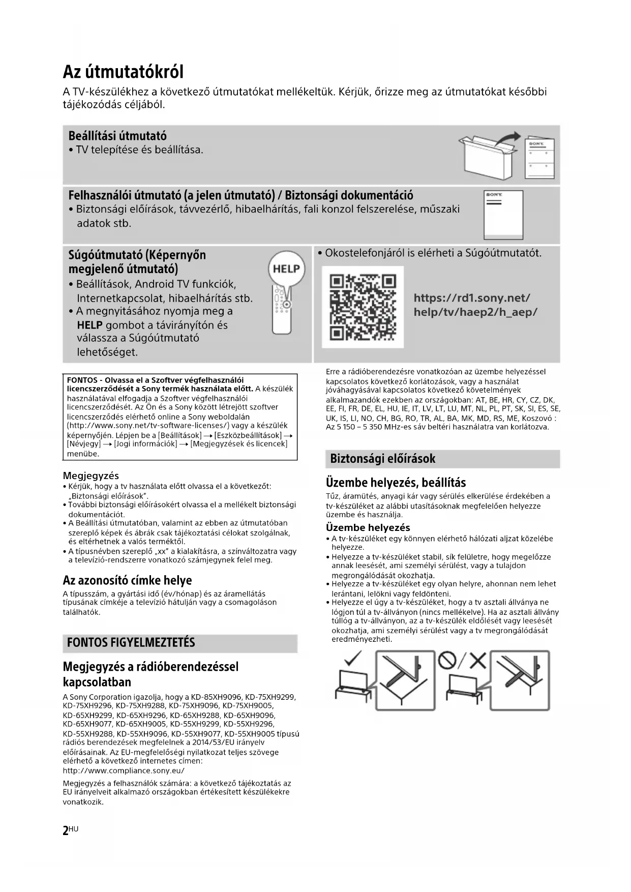 Megjegyzés a rádióberendezéssel kapcsolatban A Sony Corporation igazolja, hogy a KD-85XH9096, KD-75XH9299, KD-75XH9296, KD-75XH9288, KD-75XH9096, KD-75XH9005, KD-65XH9299, KD-65XH9296, KD-65XH9288, KD-65XH9096, KD-65XH9077, KD-65XH9005, KD-55XH9299, KD-55XH9296, KD-55XH9288, KD-55XH9096, KD-55XH9077, KD-55XH9005 típusú rádiós berendezések megfelelnek a 2014/53/EU irányelv előírásainak. Az EU-megfelelőségi nyilatkozat teljes szövege elérhető a következő internetes címen: http://www.compliance.sony.eu/Megjegyzés a felhasználók számára: a következő tájékoztatás az EU irányelveit alkalmazó országokban értékesített készülékekre vonatkozik.Erre a rádióberendezésre vonatkozóan az üzembe helyezéssel kapcsolatos következő korlátozások, vagy a használat jóváhagyásával kapcsolatos következő követelmények alkalmazandók ezekben az országokban: AT, BE, HR, CY, CZ, DK, EE, FI, FR, DE, EL, HU, IE, IT, LV, LT, LU, MT, NL, PL, PT, SK, SI, ES, SE, UK, IS, LI, NO, CH, BG, RO, TR, AL, BA, MK, MD, RS, ME, Koszovó : Az 5 150 – 5 350 MHz-es sáv beltéri használatra van korlátozva. Biztonsági előírások Üzembe helyezés, beállítás Tűz, áramütés, anyagi kár vagy sérülés elkerülése érdekében a tv-készüléket az alábbi utasításoknak megfelelően helyezze üzembe és használja. Üzembe helyezés