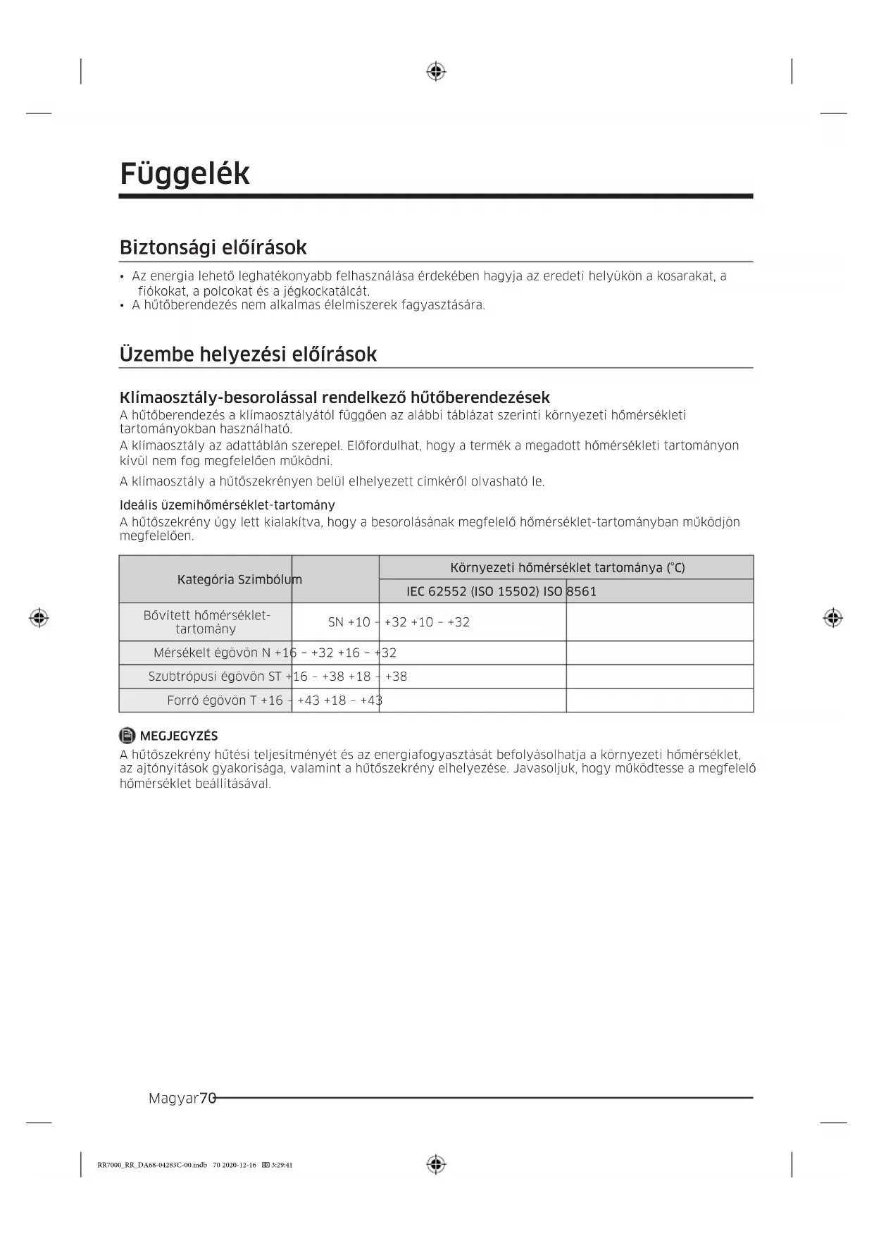 Bővített hőmérséklet- tartomány SN +10 – +32 +10 – +32 Mérsékelt égövön N +16 – +32 +16 – +32 Szubtrópusi égövön ST +16 – +38 +18 – +38 Forró égövön T +16 – +43 +18 – +43 MEGJEGYZÉS A hűtőszekrény hűtési teljesítményét és az energiafogyasztását befolyásolhatja a környezeti hőmérséklet, az ajtónyitások gyakorisága, valamint a hűtőszekrény elhelyezése. Javasoljuk, hogy működtesse a megfelelő hőmérséklet beállításával. RR7000_RR_DA68-04283C-00.indb 70 2020-12-16 3:29:41Magyar 71 Hőmérsékleti előírások Ajánlott hőmérséklet Optimális hőmérséklet-beállítás élelmiszerek tárolásához: