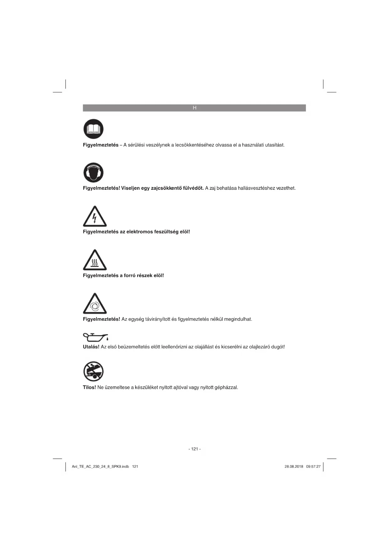 Figyelmeztetés az elektromos feszültség elöl! Figyelmeztetés a forró részek elöl! Figyelmeztetés! Az egység távirányított és fi gyelmeztetés nélkül megindulhat. Utalás! Az első beüzemeltetés előtt leellenőrizni az olajállást és kicserélni az olajlezáró dugót! Tilos! Ne üzemeltese a készüléket nyitott ajtóval vagy nyitott gépházzal. Figyelmeztetés – A sérülési veszélynek a lecsökkentéséhez olvassa el a használati utasítást. Figyelmeztetés! Viseljen egy zajcsökkentő fülvédőt. A zaj behatása hallásvesztéshez vezethet. Anl_TE_AC_230_24_8_SPK9.indb 121Anl_TE_AC_230_24_8_SPK9.indb 121 28.08.2018 09:57:2728.08.2018 09:57:27H