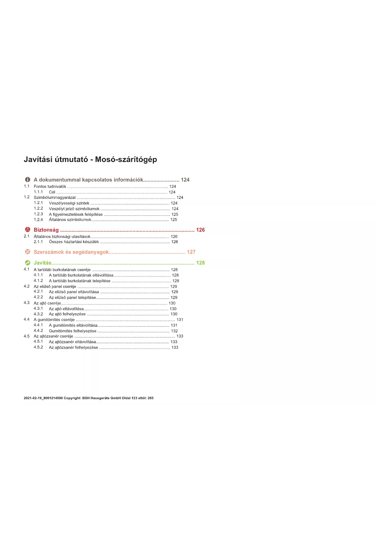 Az ajtózsanér felhelyezése ..............................................................133 Javítási útmutató-Mosó-szárítógép 2021-02-19_8001214500 Copyright: BSH Hausgeräte GmbH Oldal123ettől:265A dokumentummal kapcsolatos információk