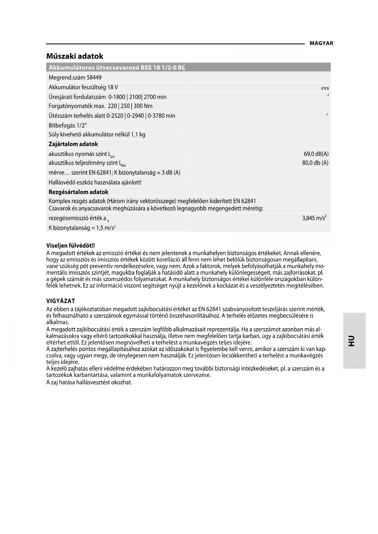 80,0 db (A) mérve… szerint EN 62841; K bizonytalanság = 3 dB (A) Hallásvédő eszköz használata ajánlott! Rezgésártalom adatok Komplex rezgés adatok (Három irány vektorösszege) megfelelően kiderített EN 62841 Csavarok és anyacsavarok meghúzására a következő legnagyobb megengedett méretig: rezegésemisszió érték a