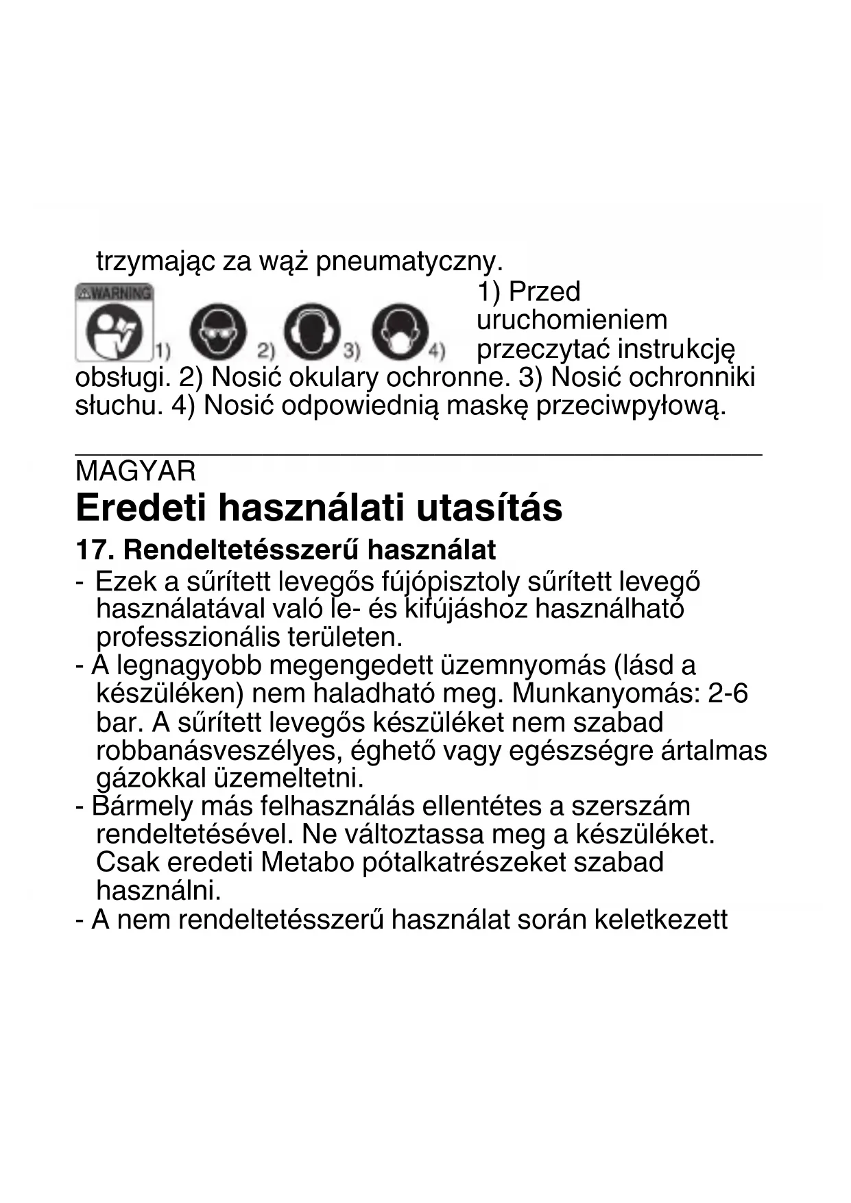 - Barmely más felhasznalás ellentétes a szerszám rendeltetésével. Ne valtoztassa meg a készüléket. Csak eredeti Metabo pótalkatrészeket szabad használni.
