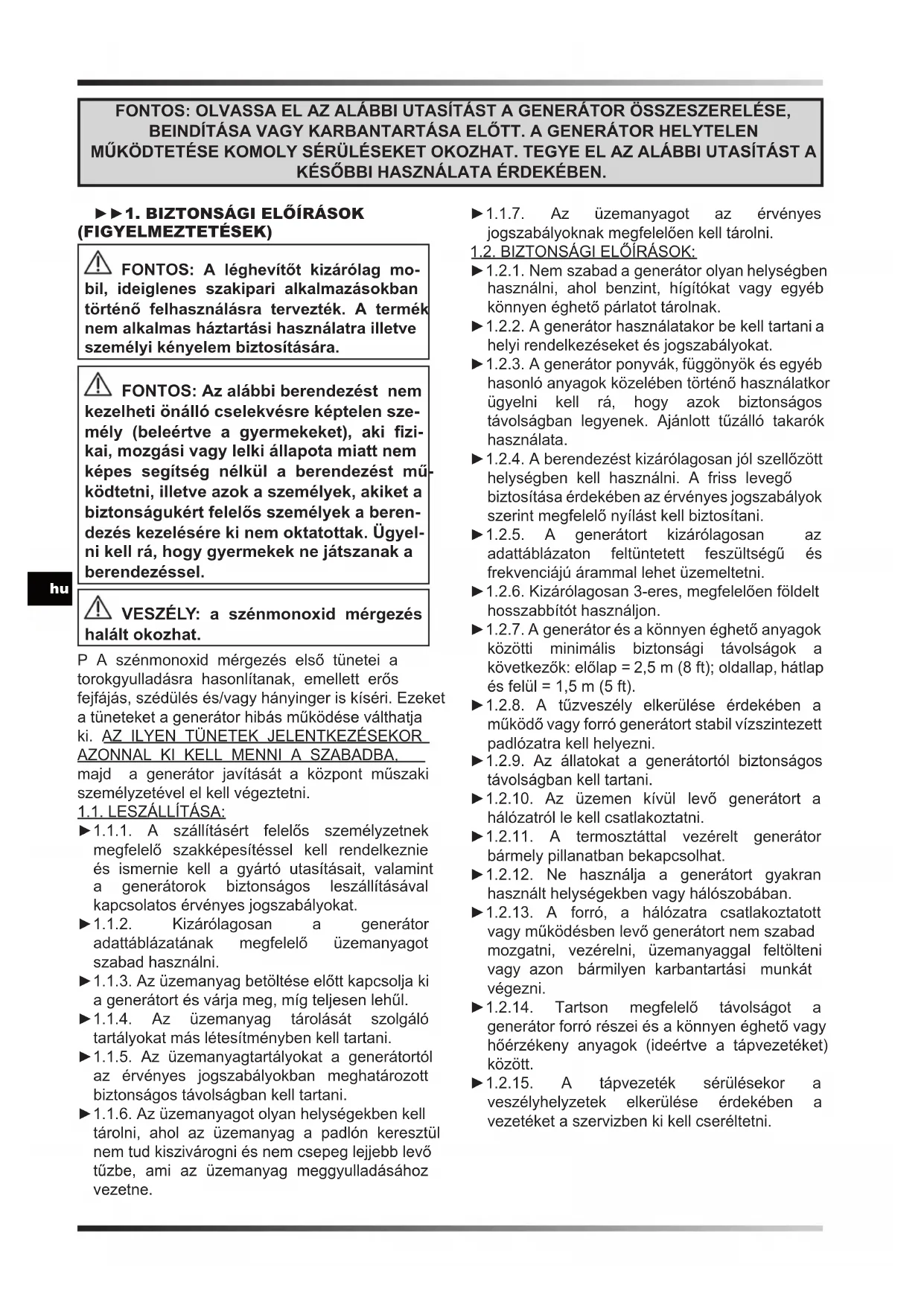 (FIGYELMEZTETÉSEK) FONTOS: A léghevítőt kizárólag mo- bil, ideiglenes szakipari alkalmazásokban történő felhasználásra tervezték. A termék nem alkalmas háztartási használatra illetve személyi kényelem biztosítására. FONTOS: Az alábbi berendezést nem kezelheti önálló cselekvésre képtelen sze- mély (beleértve a gyermekeket), aki zi- kai, mozgási vagy lelki állapota miatt nem képes segítség nélkül a berendezést mű- ködtetni, illetve azok a személyek, akiket a biztonságukért felelős személyek a beren- dezés kezelésére ki nem oktatottak. Ügyel- ni kell rá, hogy gyermekek ne játszanak a berendezéssel. VESZÉLY: a szénmonoxid mérgezés halált okozhat. P A szénmonoxid mérgezés első tünetei a torokgyulladásra hasonlítanak, emellett erős fejfájás, szédülés és/vagy hányinger is kíséri. Ezeket a tüneteket a generátor hibás működése válthatja ki. AZ ILYEN TÜNETEK JELENTKEZÉSEKOR AZONNAL KI KELL MENNI A SZABADBA, majd a generátor javítását a központ műszaki személyzetével el kell végeztetni. 1.1. LESZÁLLÍTÁSA: ►1.1.1. A szállításért felelős személyzetnek megfelelő szakképesítéssel kell rendelkeznie és ismernie kell a gyártó utasításait, valamint a generátorok biztonságos leszállításával kapcsolatos érvényes jogszabályokat. ►1.1.2. Kizárólagosan a generátor adattáblázatának megfelelő üzemanyagot szabad használni. ►1.1.3. Az üzemanyag betöltése előtt kapcsolja ki a generátort és várja meg, míg teljesen lehűl. ►1.1.4. Az üzemanyag tárolását szolgáló tartályokat más létesítményben kell tartani. ►1.1.5. Az üzemanyagtartályokat a generátortól az érvényes jogszabályokban meghatározott biztonságos távolságban kell tartani. ►1.1.6. Az üzemanyagot olyan helységekben kell tárolni, ahol az üzemanyag a padlón keresztül nem tud kiszivárogni és nem csepeg lejjebb levő tűzbe, ami az üzemanyag meggyulladásához vezetne. ►1.1.7. Az üzemanyagot az érvényes jogszabályoknak megfelelően kell tárolni. 1.2. BIZTONSÁGI ELŐÍRÁSOK: ►1.2.1. Nem szabad a generátor olyan helységben használni, ahol benzint, hígítókat vagy egyéb könnyen éghető párlatot tárolnak. ►1.2.2. A generátor használatakor be kell tartani a helyi rendelkezéseket és jogszabályokat. ►1.2.3. A generátor ponyvák, függönyök és egyéb hasonló anyagok közelében történő használatkor ügyelni kell rá, hogy azok biztonságos távolságban legyenek. Ajánlott tűzálló takarók használata. ►1.2.4. A berendezést kizárólagosan jól szellőzött helységben kell használni. A friss levegő biztosítása érdekében az érvényes jogszabályok szerint megfelelő nyílást kell biztosítani. ►1.2.5. A generátort kizárólagosan az adattáblázaton feltüntetett feszültségű és frekvenciájú árammal lehet üzemeltetni. ►1.2.6. Kizárólagosan 3-eres, megfelelően földelt hosszabbítót használjon. ►1.2.7. A generátor és a könnyen éghető anyagok közötti minimális biztonsági távolságok a következők: előlap = 2,5 m (8 ft); oldallap, hátlap és felül = 1,5 m (5 ft). ►1.2.8. A tűzveszély elkerülése érdekében a működő vagy forró generátort stabil vízszintezett padlózatra kell helyezni. ►1.2.9. Az állatokat a generátortól biztonságos távolságban kell tartani. ►1.2.10. Az üzemen kívül levő generátort a hálózatról le kell csatlakoztatni. ►1.2.11. A termosztáttal vezérelt generátor bármely pillanatban bekapcsolhat. ►1.2.12. Ne használja a generátort gyakran használt helységekben vagy hálószobában. ►1.2.13. A forró, a hálózatra csatlakoztatott vagy működésben levő generátort nem szabad mozgatni, vezérelni, üzemanyaggal feltölteni vagy azon bármilyen karbantartási munkát végezni. ►1.2.14. Tartson megfelelő távolságot a generátor forró részei és a könnyen éghető vagy hőérzékeny anyagok (ideértve a tápvezetéket) között. ►1.2.15. A tápvezeték sérülésekor a veszélyhelyzetek elkerülése érdekében a vezetéket a szervizben ki kell cseréltetni.