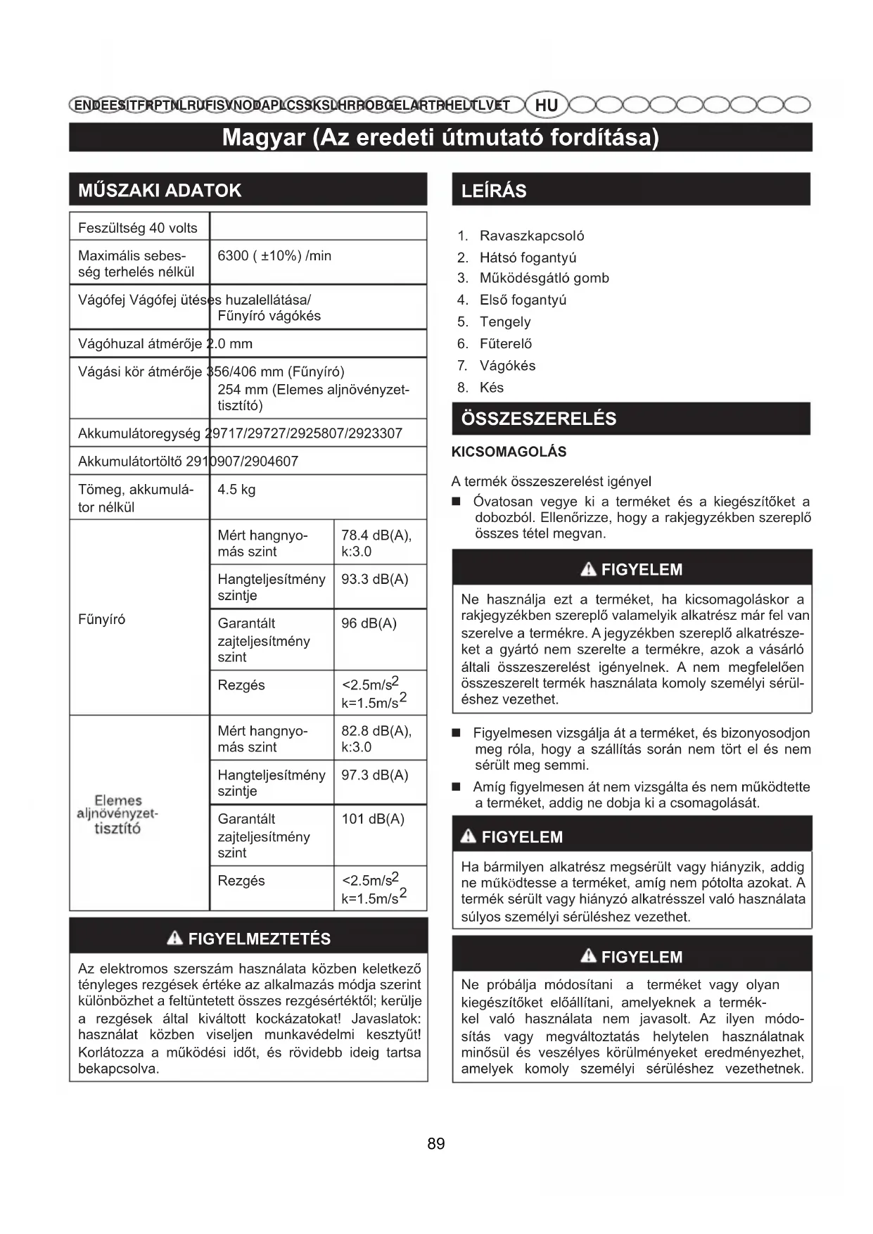 EN DE ES IT FR PT NL RU FI SV NO DA PL CS SK SL HR RO BG EL AR TR HE LT LV ET FIGYELEM Zajszint. Működése közben a gép elkerülhetetlenül zajt bocsát ki. A hangos munkavégzés engedélyköteles, és bizonyos időszakokra van korlátozva. A pihenőidőkön túl szükség lehet a munkaórák tiszteletben tartására is. Saját maga illetve a közelben tartózkodó szemé- lyek védelme érdekében megfelelő zajvédő eszközök használata kötelező; Rezgések Viseljen mindig rezgéscsillapító kesztyűt. A túlzott rezgésszint miatt az ujjai elfehéredhetnek, il- letve kéztőalagút szindróma léphet fel. Amennyiben a gép használata közben kezén a bőr elfehéredik, és kellemetlen érzése van, haladéktalanul szakítsa félbe a munkát. Tartson megfelelő szüneteket a munkában. A gépet rendszeresen használó személyeknek rendszere- sen ellenőriztetniük kell a kéz ujjainak állapotát. FIGYELEM A motoros kasza vágófejével való esetleges érintkezés súlyos személyi sérüléseket okozhat. JAVASLATOK KASZÁLÁSHOZ Lásd a 6. ábrát. Az optimális kaszáló helyzetet úgy kapja, ha megdönti a motoros kaszát a vágási terület felé. A kaszálás eredményesebb, ha a szerszámot a munkaterületen balról jobbra mozgatja; kevésbé eredményes, ha jobbról balra mozgatja. A kaszáláshoz a huzal végét használja; ne nyomja a huzaltartó fejet a fűbe. A huzal hamarabb elkopik, teljesen tönkremegy, ha szögesdróttal és kerítéssel érintkezik. Kövek, téglák, járdák és fadarabok hamar elkoptatják a huzalt. Ne érjen fákhoz és bokrokhoz. A huzal megsértheti a fakérget, a díszléceket, a kerítéspaneleket és -oszlopokat. Működés közben szerelje fel a fém beállítógombot a hátsó fogantyú gumis furatára, oldja ki, és távolítsa el a fém beállítógombot, amikor nem használja.. HUZAL AUTOMATIKUS BETÁPLÁLÁSA Lásd a 7. ábrát. A szegélyvágó használatakor a vágószál elhasználódik és rövidebbé válik. A szegélyvágó el van látva egy ütköző száladagolóval, ami további vágószálat adagol, amikor a fej forgás közben a talajhoz ütődik. A vágókés a vágásszélességhez megfelelő hosszúságra vágja a szálat. ÁLLÍTHATÓ VÁGÁSI ÁTMÉRŐ Lásd 8. ábra. A szegélyvágó jelenleg 14 in. vágási szélességre van beál- lítva. A vágásszélesség 16 in. szélességre állításához: Vegye ki az akkumulátort a szegélyvágóból. Távolítsa el mindkét csavart a vágókésből egy csillagfejű csavarhúzó segítségével (nincs mellékelve). Forgassa el 180°-kal a vágókést. Helyezze vissza mindkét csavart a vágókésbe. Megjegyzés: Állítsa a vágókést 14 in. hosszúságra a hosszabb működési időhöz. Állítsa a vágókést 16 in. hosszúságra a nagyobb vágási területhez. Megjegyzés: a kisebb vágásátmérő maximalizálja a működési időt és a vágási sebességet, míg a nagyobb vágásátmérő segít a vágási feladat gyorsabb elvégzé- sében. HUZALVÁGÓ KÉS Lásd a 8. ábrát. A szerszámon, a fűterelőn található egy huzalvágó kés. Az optimális vágáshoz tekerje le a huzalt addig, amíg a huzalvágó kés a helyes hosszban le nem vágja. Minden alkalommal tekerje le a vágóhuzalt, amikor úgy észleli, a motor a szokásosnál többet forog, illetve a kaszálás hatékonysága csökken.Ezzel lehetővé teszi az optimális hatékonyság és a vágóhuzal megfelelő hosszának megtartásával a megfelelő munkavégzést. FIGYELEM Alkatrészcsere esetén kizárólag eredeti pótalkatrésze- ket használjon. Más alkatrészek alkalmazása veszélyt jelenthet, vagy károsíthatja a készüléket. FIGYELEM A súlyos sérülések elkerülése érdekében mindig vegye ki az akkumulátort a készülékből, amikor tisztítja, vagy karbantartja.