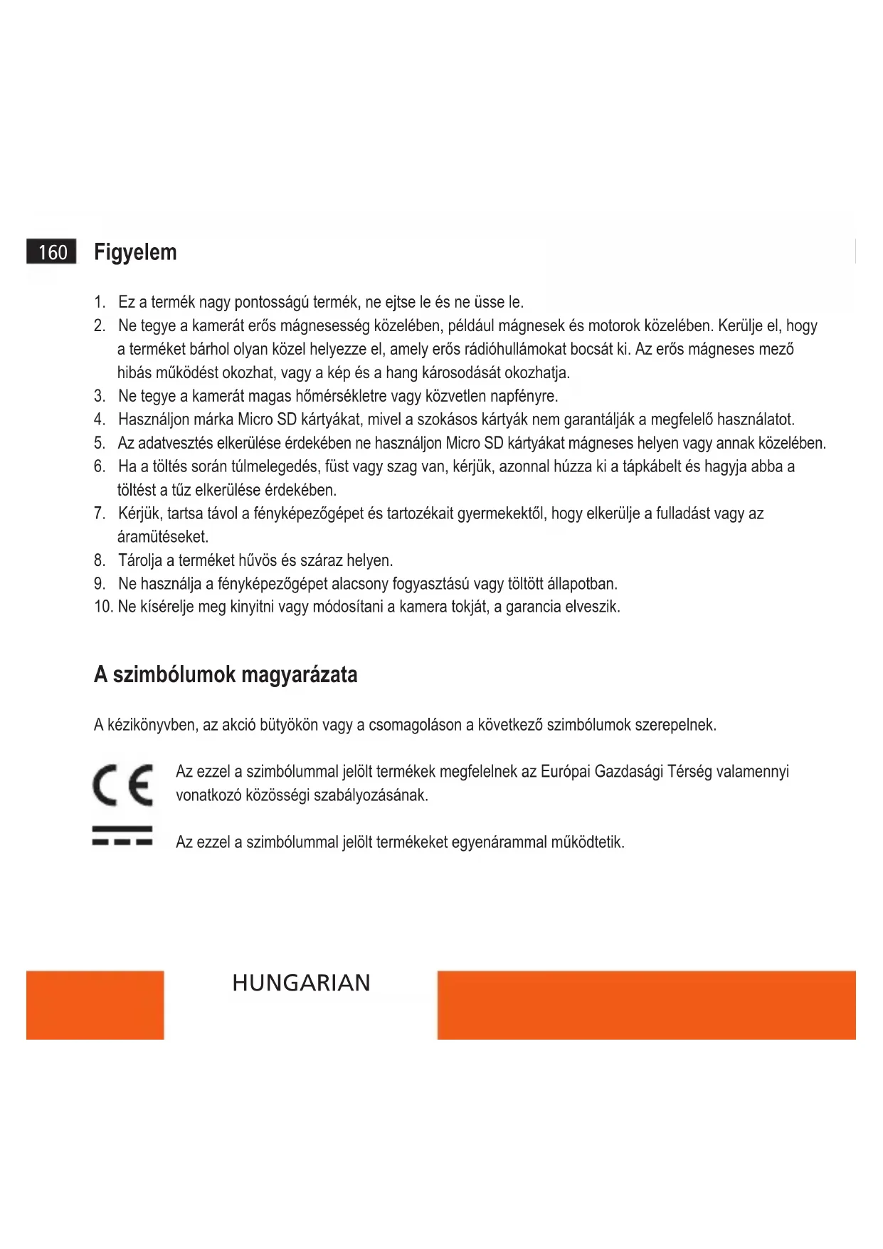 HUNGARIAN171 Szel mód / Váltás az első kijelzőre Akijelzőkátváltásáhoznyomjameg3másodpercigaModegombot. Webkamera funkció AzActioncam8sPluswebkamerakéntishasználható.Ehhezállítsaaz„USB”elemetabeállításokmenüben „PCCAM”elemre,feltétlenülhelyezzenbeegymicroSD-kártyát,majdUSB-nkeresztülcsatlakoztassaakamerát aszámítógéphez. WebkamerakéntakamerateljesHDfelbontása1920x1080px,képkockasebességepedig30kép/mp. Megjegyzés: Felhívjukgyelmét,hogykülönmikrofonravanszükségeazaudioátvitelhez,mivelabelsőmikrofont nemhasználjákerreafunkcióra. Akamerawebkamerávalvalókompatibilitásaahasználtprogramtólisfügg. Külső monitor csatlakoztatása KülsőmonitortcsatlakoztathatamikroHDMIportonkeresztül.Akameraösszesfelbontásátfelbontáskénthasznál- hatja,amennyibenamonitortámogatjaazokat. Megjegyzés:Akameranemtámogatjaazélőonlineközvetítést. Távirányító Amellékelttávirányítóvaltávolrólisműködtethetiazakciókamerát.Kétexponálógomb van,azegyikafotómódhoz(1),amásikpedigavideómódhoz(2),amelyekképeket készítenek,vagymegkezdikésbefejezikavideórögzítését. Atávirányítórádiófrekvenciája:2,412–2472GHz;Átviteliteljesítmény:10mW. Megjegyzés:Atávirányítónemvízálló.172 HUNGARIAN Tároló / Mikrokártyák Ezakamerakompatibilisa8GB,16GB,32GBés64GBkapacitásúMicroSDésMicroSDXCmemóriakártyák- kal.LegalábbU3vagyV30sebességűmicroSDkártyátkellhasználnia.Javasoljukamárkanévmemóriakártyák használatátamaximálismegbízhatóságérdekébenamagasrezgésűtevékenységeksorán Tippek: