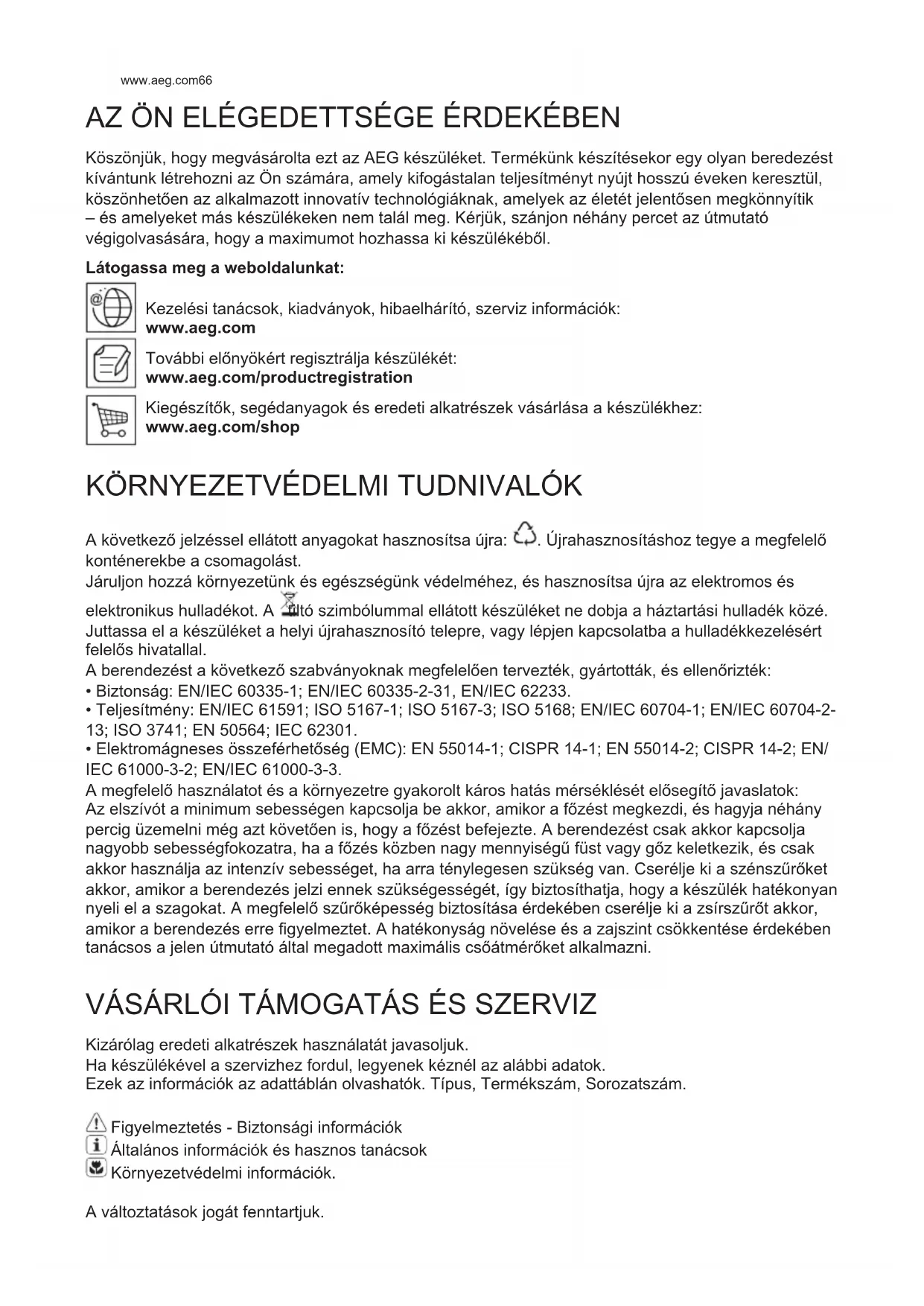 ϖϼϾЂЄϼЅІЂ϶ЇϽІϹ ϸϿГ ЊАЂϷЂ ϿϼЌϹ ϷϴϿЂϷϹЁЁЙ ϿϴЀЃϼ Ёϴ 12V -20W ЀϴϾЅ - G4, ЁϹ ϸЂІЂЄϾЇВЋϼЅА ϸЂ ЁϼЉ ЄЇϾϴЀϼ.www.aeg.com66 Köszönjük, hogy megvásárolta ezt az AEG készüléket. Termékünk készítésekor egy olyan beredezést kívántunk létrehozni az Ön számára, amely kifogástalan teljesítményt nyújt hosszú éveken keresztül, köszönhetĪen az alkalmazott innovatív technológiáknak, amelyek az életét jelentĪsen megkönnyítik – és amelyeket más készülékeken nem talál meg. Kérjük, szánjon néhány percet az útmutató végigolvasására, hogy a maximumot hozhassa ki készülékébĪl. Látogassa meg a weboldalunkat: Kezelési tanácsok, kiadványok, hibaelhárító, szerviz információk: www.aeg.com További elĪnyökért regisztrálja készülékét: www.aeg.com/productregistration KiegészítĪk, segédanyagok és eredeti alkatrészek vásárlása a készülékhez: www.aeg.com/shop AZ ÖN ELÉGEDETTSÉGE ÉRDEKÉBEN