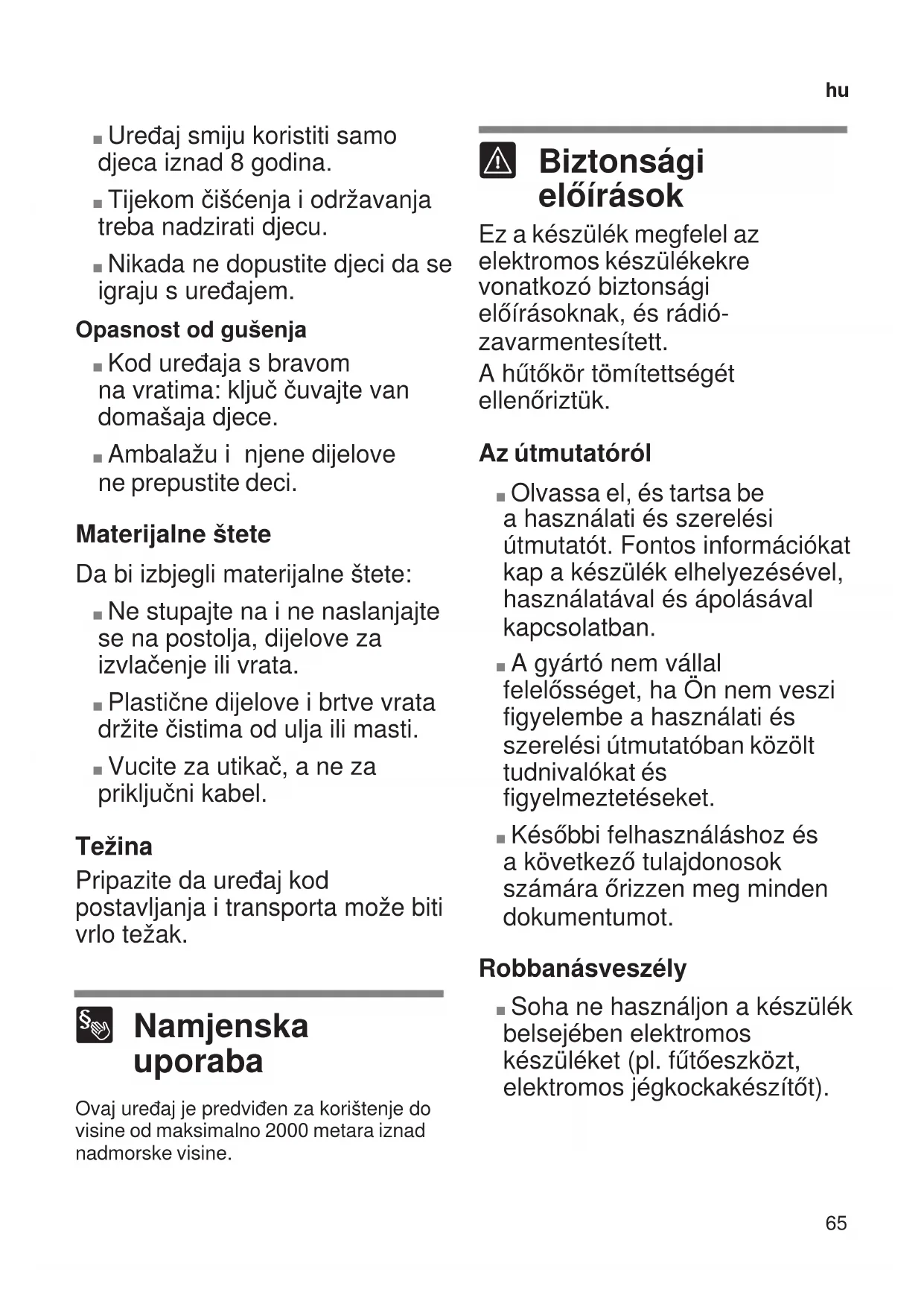 Kockázatok elkerülése gyermekek és veszélyeztetett személyek esetében Veszélyeztetve vannak: ■ Gyermekek, ■ csökkent fizikai, értelmi vagy mentális képességű személyek, ■ a készülék biztonságos használatához elegendő tudással nem rendelkező személyek. Tennivalók: ■ Biztosítani kell, hogy a gyermekek és a veszélyeztetett személyek megértsék a veszélyeket. ■ Egy biztonságért felelős személynek felügyelnie vagy irányítania kell a gyermekeket és a veszélyeztetett személyeket a készüléknél. ■ A készüléket csak 8 évnél idősebb gyermekek használhatják. ■ Tisztítás és karbantartás közben felügyelni kell a gyermekeket. ■ Soha ne engedjen gyerekeket a készülékkel játszani. Fulladásveszély ■ Ajtózáras készülék esetén: A kulcsot olyan helyen tárolja, ahol gyermekek nem férnek hozzá. ■ Ne engedje, hogy gyermekek a csomagolással, annak részeivel játsszanak. Dologi károk Dologi károk elkerülése érdekében: ■ Ne lépjen, ill. támaszkodjon az alapzatra, a fiókokra, az ajtókra. ■ A műanyag alkatrészeket és az ajtótömítéseket tartsa olaj- és zsírmentesen. ■ A dugónál, nem pedig a csatlakozó kábelnél fogva húzza ki. Súly A készülék felállítása és szállítása közben vegye figyelembe, hogy a készülék nagyon nehéz lehet.