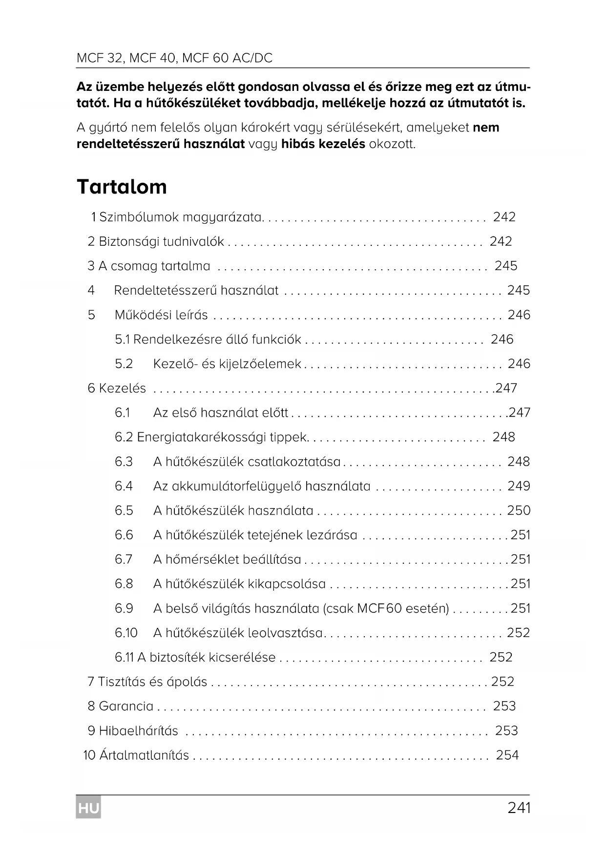 - Az üzembe helyezés előtt gondosan olvassa el és őrizze meg ezt az útmu- tatót. Ha a hűtőkészüléket továbbadja, mellékelje hozzá az útmutatót is. A gyártó nem felelős olyan károkért vagy sérülésekért, amelyeket nem rendeltetésszerű használat vagy hibás kezelés okozott. Tartalom 1 Szimbólumok magyarázata p. 242
