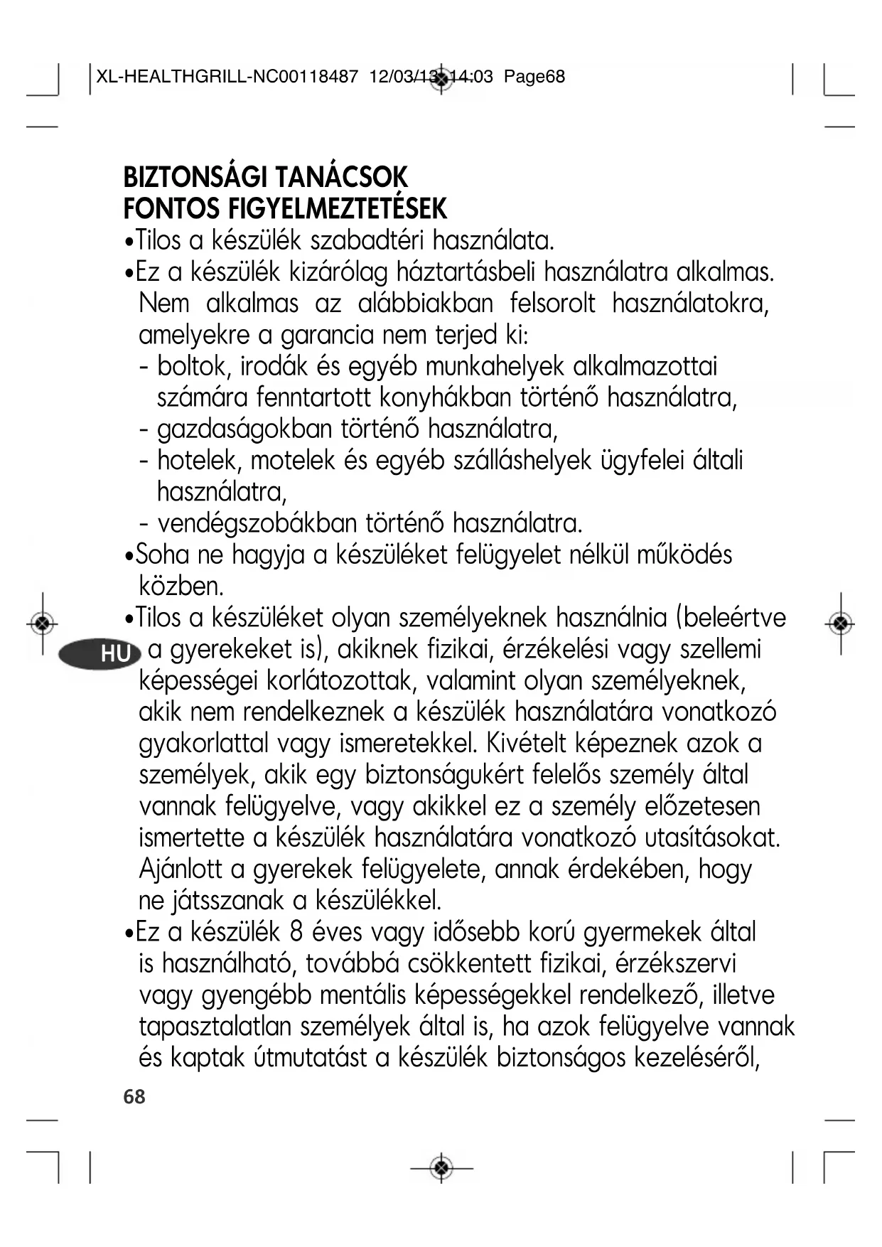 XL-HEALTHGRILL-NC00118487 12/03/13 14:03 Page68valamint megértették a vele járó veszélyeket. A gyerekek ne játsszanak a készülékkel! A tisztítást és a karbantartást nem végezhetik 8 évnél fiatalabb gyermekek és az idősebbek is csak felügyelet mellett. Tartsa a készüléket és a kábelt távol a 8 évnél fiatalabb gyermekektől.